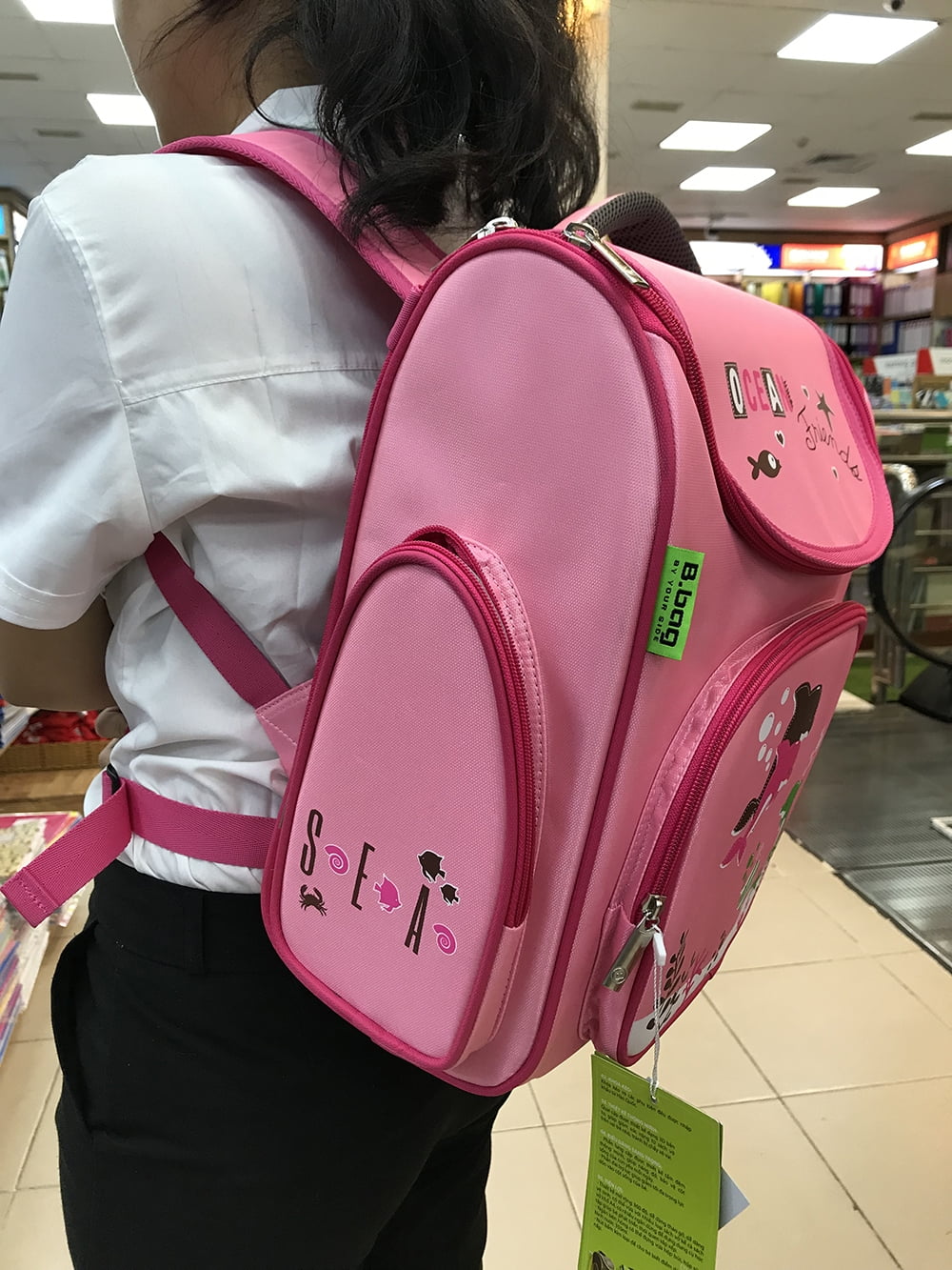 BA LÔ CHỐNG GÙ OCEAN FRIENDS MÀU HỒNG NHẠT Mã số B-12-017 Màu sắc: Hồng nhạt Loại vải: Vải PVC xéo xuất xứ Hàn Quốc, siêu bền chống thấm nước. Vải lót chống thấm loại tốt, bền và nhẹ. Dây kéo: Số 5, nhẹ bền. Đầu kéo: Số 5, xi không gỉ. Quai đeo: Quai đeo thiết kế dạng 3D bản to, giúp giảm sức nặng từ sách vở lên vai trẻ nhỏ, tránh bị chảy xệ vai. Số ngăn: 1 ngăn chính, ngăn lưới phía trong, 1 ngăn đựng bút phía trước, 2 túi để bình nước bên hông. Dây cân bằng trọng lượng: được thắt vào phần eo (ngay dưới khung xương sườn) trợ lực cho bé khi mang nặng. Phần lưng được thiết kế đặc biệt với các miếng đệm giúp cặp vừa khớp với độ cong của cột sống, trọng lượng cặp được phân tán đều nên giảm sức nặng khi mang, giúp các bé không bị đau hay xệ vai khi đeo cặp. Ba lô chống gù Bitex sẽ là món quà ý nghĩa và là người bạn đồng hành cùng bé đến trường .