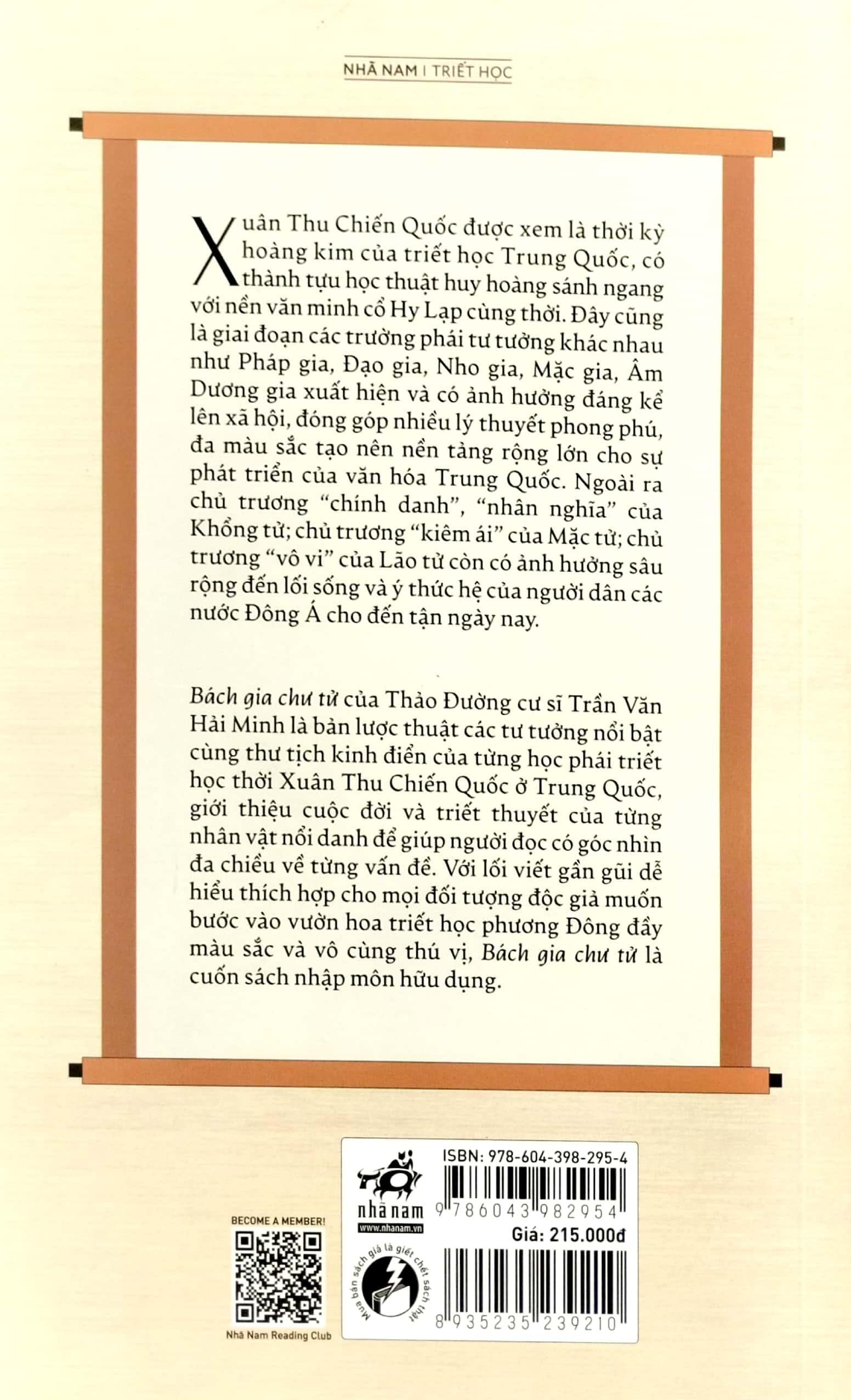 Bách gia chư tử của Thảo Đường cư sĩ Trần Văn Hải Minh là bản lược thuật các tư tưởng nổi bật cùng thư tịch kinh điển của từng học phái triết học thời Xuân Thu Chiến Quốc ở Trung Quốc, giới thiệu cuộc đời và triết thuyết của từng nhân vật nổi danh để giúp người đọc có góc nhìn đa chiều về từng vấn đề. Với lối viết gần gũi dễ hiểu thích hợp cho mọi đối tượng độc giả muốn bước vào vườn hoa triết học phương Đông đầy màu sắc và vô cùng thú vị, Bách gia chư tử là cuốn sách nhập môn hữu dụng.