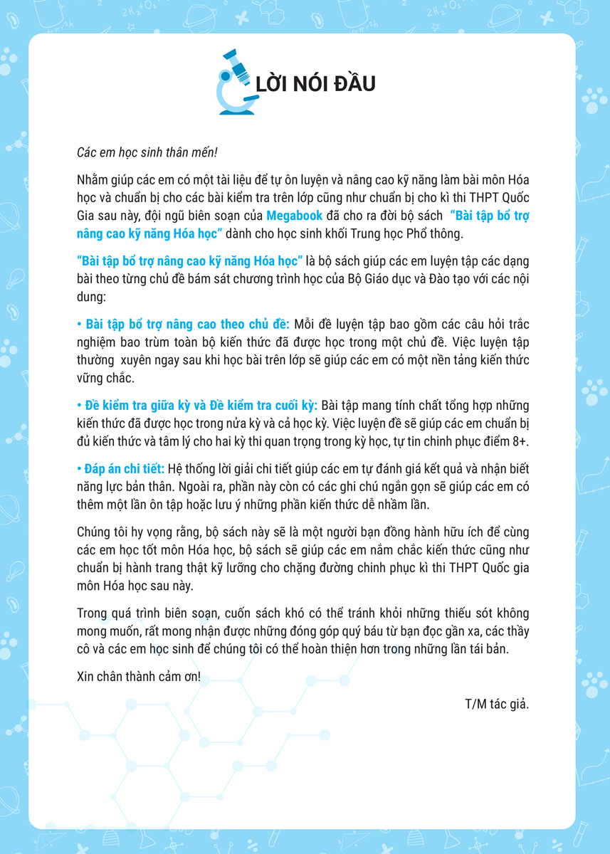 Megabook hy vọng rằng, bộ sách này sẽ là một người bạn đồng hành hữu ích để cùng các em học tốt môn Hóa học, bộ sách sẽ giúp các em nắm chắc kiến thức cũng như chuẩn bị hành trang thật kỹ lưỡng cho chặng đường chinh phục kì thi THPT Quốc gia môn Hóa học sau này.