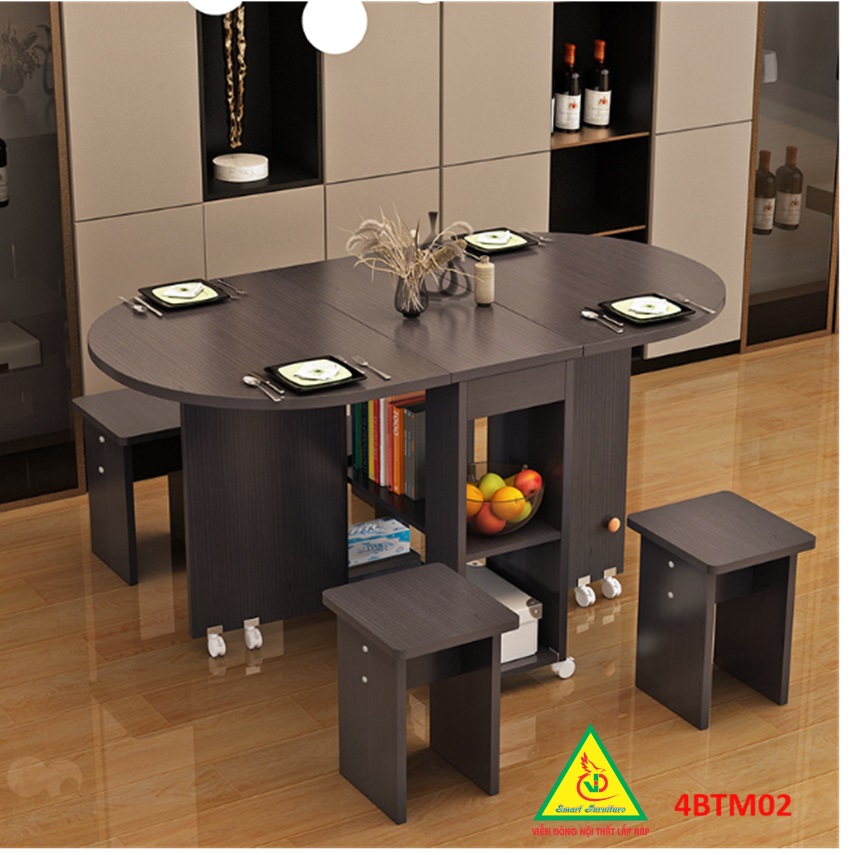 Bàn ăn gấp gọn thông minh Với các gia đình có diện tích phòng ăn không lớn lắm thì Bàn ăn gấp gọn này chính là sự lựa chọn lý tưởng nhất. Bàn ăn có kích thước nhỏ gọn, kết cấu thông minh có thể gấp gọn lại khi không sử dụng tiết kiệm diện tích. Bàn được làm bằng gỗ công nghiệp MDF cao cấp phủ melamine láng mịn, tính thẩm mỹ cao thu hút được sự chú ý của khách hàng. Tích hợp 3 in 1: Bàn, Tủ và Kệ thật Sang - Chảnh - Đẳng Cấp Dù nhà lớn hay nhỏ thì chiếc Bàn Ăn Thông Minh sẽ làm không gian gọn gàng hơn, thoáng hơn và đẹp hơn.