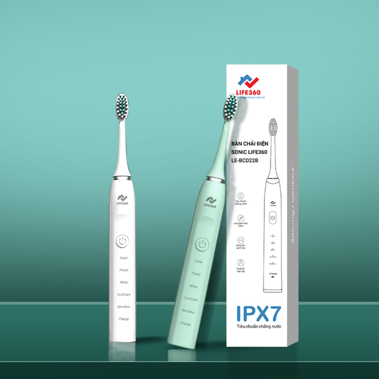 Bàn chải đánh răng thương hiệu Life 360 hiện có 5 chế độ chải răng linh hoạt bao gồm: Làm sạch, Đánh bóng, Làm trắng, Massage nướu, Cho răng nhạy cảm