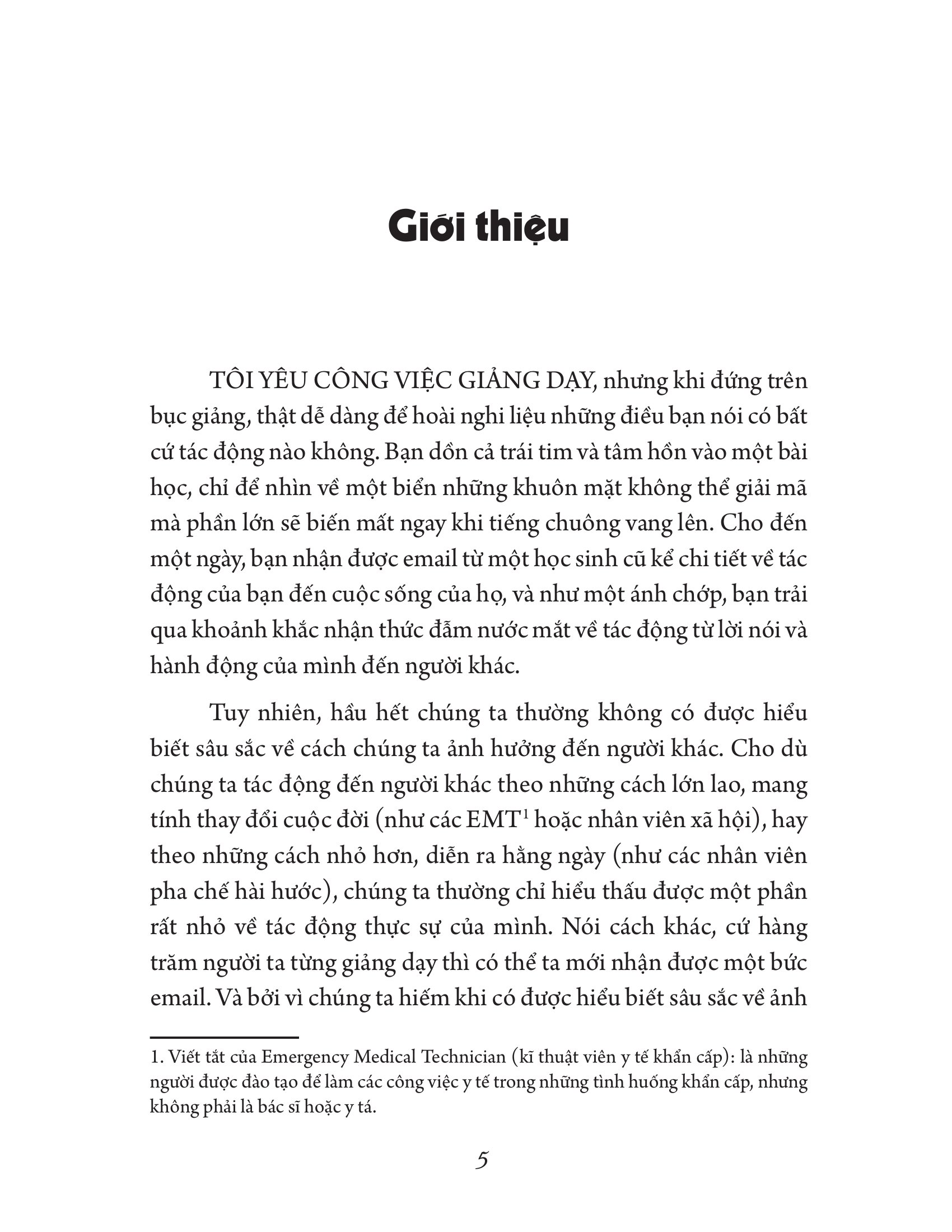 Hầu hết chúng ta thường không có được hiểu biết sâu sắc về cách chúng ta ảnh hưởng đến người khác. Cho dù chúng ta tác động đến người khác theo những cách lớn lao, mang tính thay đổi cuộc đời, hay theo những cách nhỏ hơn, diễn ra hằng ngày, chúng ta thường chỉ hiểu thấu được một phần rất nhỏ về tác động thực sự của mình. Và bởi chúng ta hiếm khi có được hiểu biết sâu sắc về ảnh hưởng của bản thân đối với người khác nên có thể chúng ta đã thường xuyên đánh giá thấp mức độ ảnh hưởng của mình.