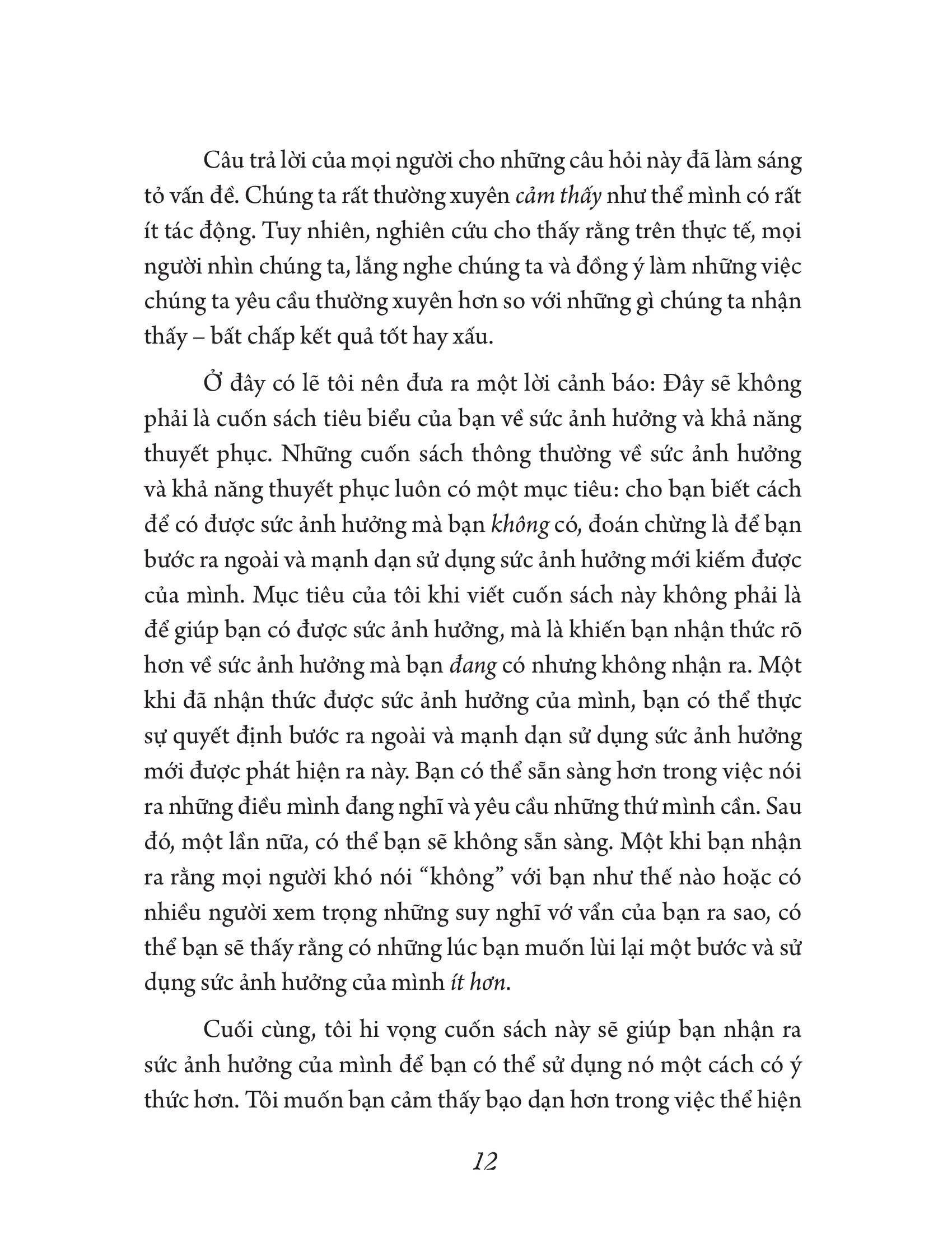 Không chỉ dành nhiều thời gian giảng dạy và nghiên cứu về hành vi xã hội, quan điểm và cảm xúc tự ý thức của con người, tác giả - Nhà Tâm lí học Xã hội kiêm Giáo sư về hành vi tổ chức tại Đại học Cornell, Vanessa Bohns đã giải thích lí do tại sao chúng ta không nhận ra sức ảnh hưởng mình có trong cuốn sách này. Đồng thời, bà cũng chỉ rõ ra rằng sự thiếu nhận thức về sức ảnh hưởng của bản thân có thể khiến chúng ta bỏ lỡ cơ hội, hay vô tình lạm dụng quyền lực của mình như thế nào.