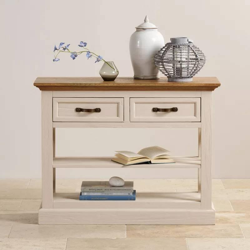 Bàn console 2 ngăn kéo Seychelles có kiểu dáng nhỏ gọn, rất thích hợp đặt ở khu vực hành lang và lối vào. Thiết kế mang đặc trưng của bộ sưu tập Seychelles với màu sơn trắng xám nhẹ nhàng, kết hợp hài hòa màu nâu tự nhiên của gỗ. Hai mặt bên với chi tiết trang trí chéo riêng biệt, đường viền trang trí bắt mắt mang lại sự tươi mới và khác biệt cho ngôi nhà của bạn. Bàn được làm từ gỗ sồi trắng Mỹ nhập khẩu, áp dụng kỹ thuật ghép mộng truyền thống vào chế tác tạo nên một tổng thể chắc chắn và bền đẹp theo thời gian. Hai ngăn kéo rộng rãi sẽ là nơi lưu trữ tiện dụng cho các vật dụng trong nhà trở nên gọn gàng và ngăn nắp.
