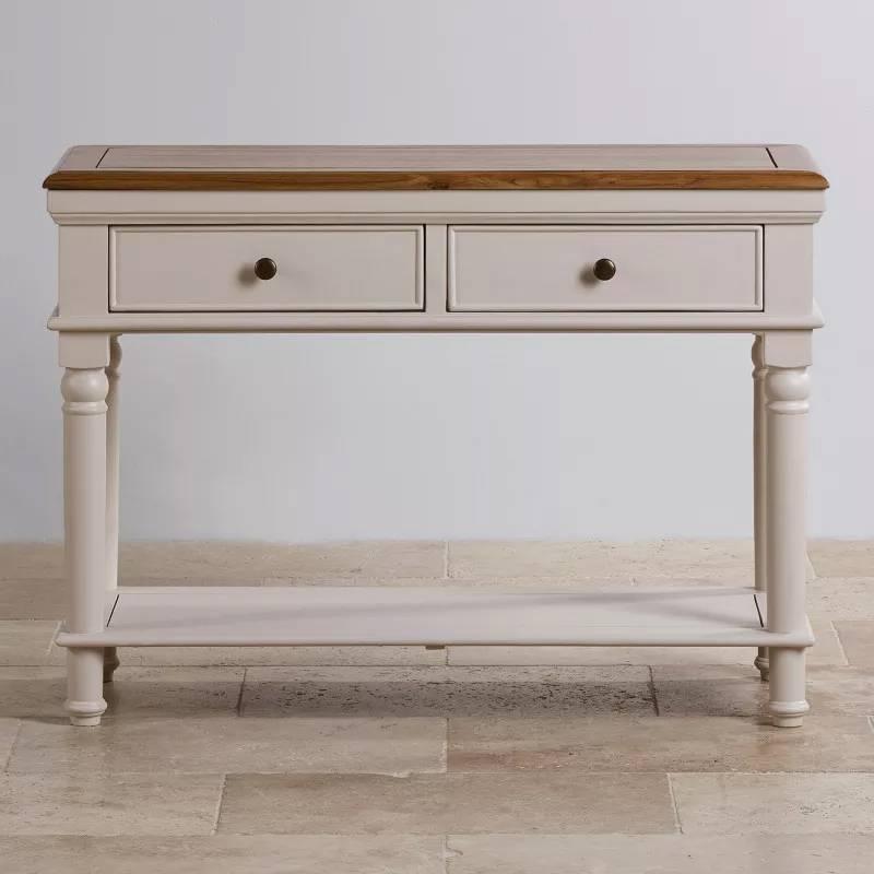 Bàn console 2 ngăn kéo Shay là tập hợp hoàn hảo về vẻ ngoài và chất lượng tốt nhất cho nội thất ngôi nhà của bạn. Nó phù hợp cho khu vực hành lang, lối vào và phòng khách mang phong cách từ truyền thống đến hiện đại. Các ngăn kéo được chế tác thủ công, kết cấu ghép mộng chắc chắn, đáp ứng nhu cầu lưu trữ đa dạng. Tổng thể sơn màu trắng xám nhẹ nhàng, kết hợp hài hòa với màu sắc nâu tự nhiên của mặt bàn được làm từ chất liệu gỗ sồi trắng Mỹ nhập khảu cao cấp. Sản phẩm có tất cả các điểm nổi bật của bộ sưu tập Shay với thiết kế bo tròn, nhẹ nhàng mang lại cái nhìn tinh tế và cảm giác cổ điển cho nội thất ngôi nhà.
