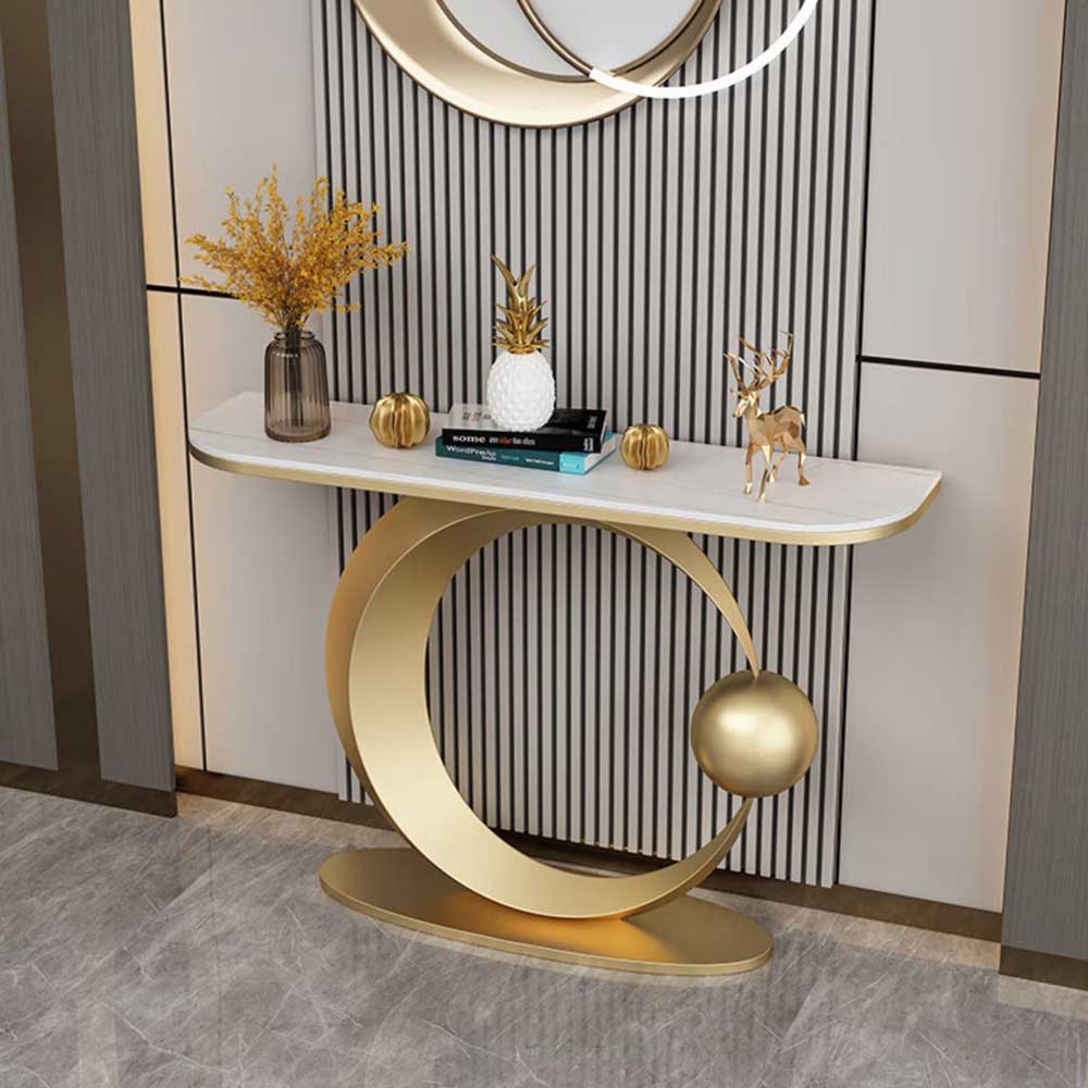Bàn console, bàn trang trí mặt đá trắng khung sơn vàng CSTCT019 với điểm nhấn khung sắt sơn màu vàng kết hợp mặt đá trắng vân tạo toát lên vẻ đẹp sang trọng giúp nâng tầm giá