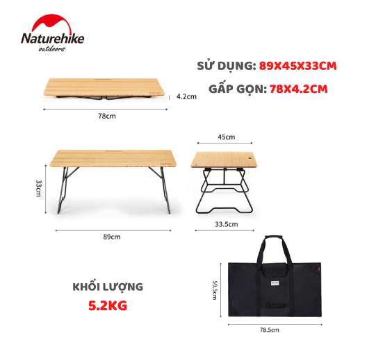 - THÔNG TIN SẢN PHẨM - Thương hiệu: NatureHike - Dòng sản phẩm: Glamping - Mã sản phẩm: NH22JU011 - Chất liệu: + Mặt bàn: gỗ tre + Chân bàn: sắt mạ đen + Túi: Vải Oxford 630D - Kích thước sử dụng: 398933cm - Kích thước gấp gọn: 45784.2cm - Trọng lượng: 5,2kg - Tải trọng: 30kg - Xuất xứ: Trung Quốc