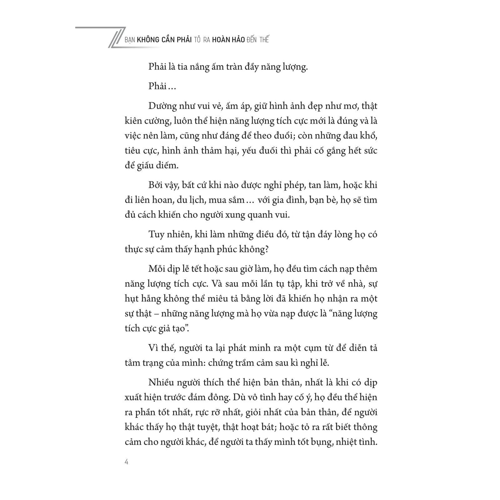 Cuốn sách Bạn Không Cần Phải Tỏ Ra Hoàn Hảo Đến Thế sẽ hỗ trợ bạn đồng cảm, thấu hiểu và chia sẻ cảm xúc của mình một cách tích cực và chân thành; cũng như giúp bạn học cách yêu thươngvà được yêu thương, mở lòng mình với đối phương thật chân thực;từ đó bạn sẽ sống một cuộc đời nhẹ nhàng và ý nghĩa hơn!