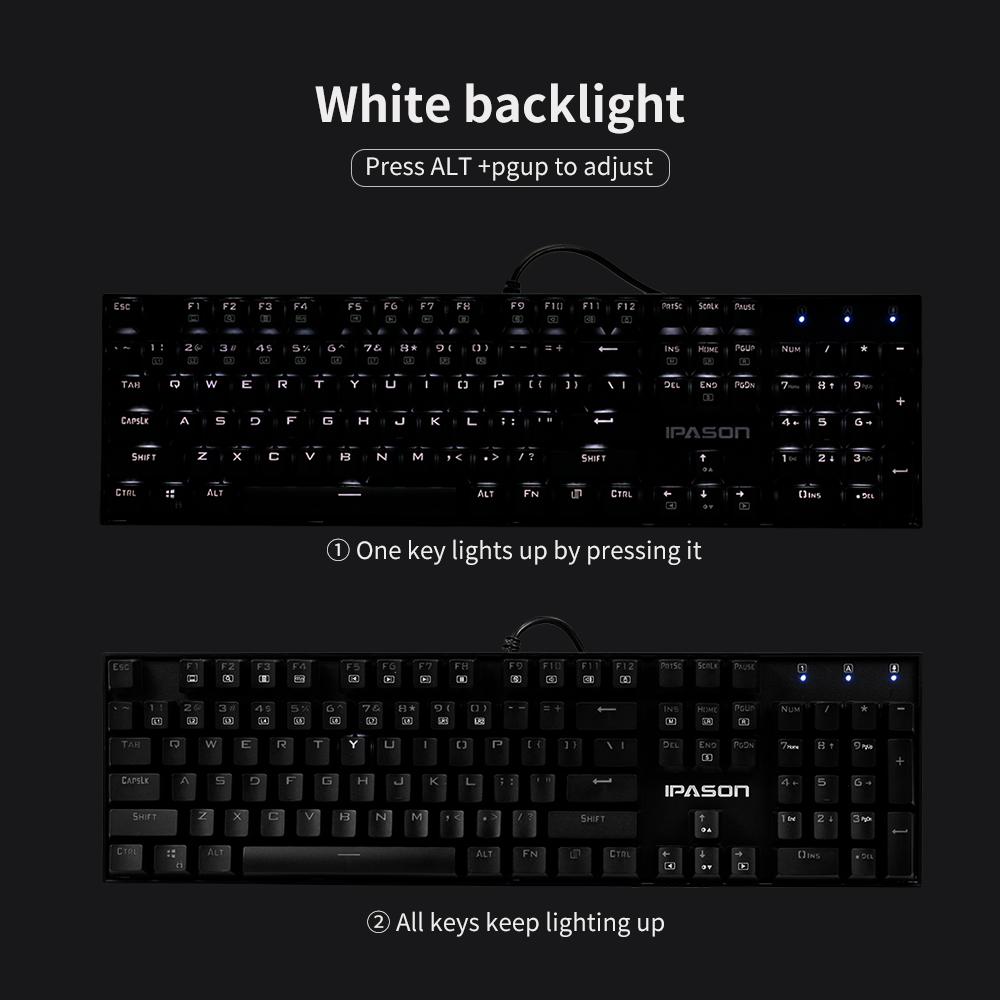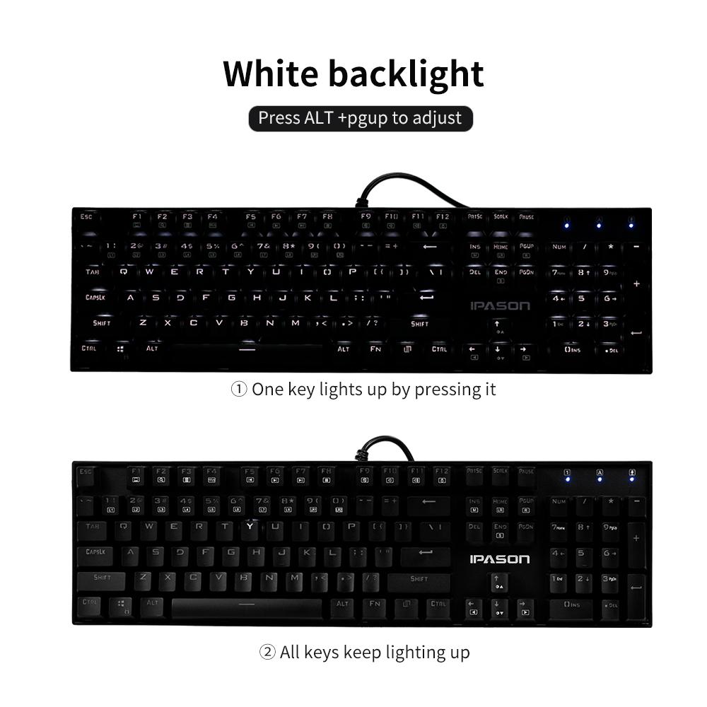 IPASON Mechanical Keyboard is designed for game player. 104 N-key rolloverkey with backlit gives you ultimate game experience. Mechanical blue switchbrings quick response and let you enjoy smooth game playing.