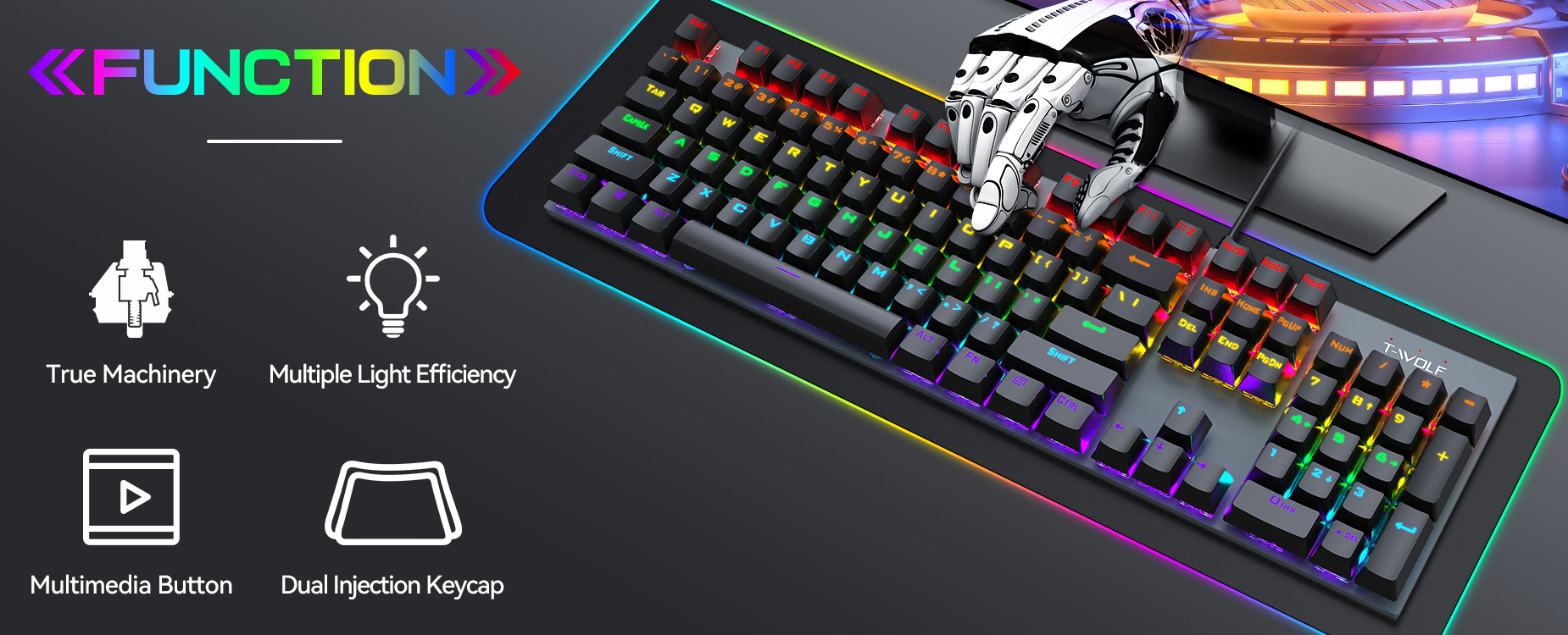 T-Wolf T17 sở hữu thiết kế hiện đại, trẻ trung với tông màu đen chủ đạo, cùng hệ thống đèn LED RGB rực rỡ, tạo điểm nhấn cho góc làm việc hay chơi game của bạn. Sử dụng Blue Switch chất lượng cao, mang đến cảm giác gõ phím nảy tốt, âm thanh clicky rõ ràng, giúp bạn thao tác chính xác và tự tin trong mọi công việc hay trận chiến game.