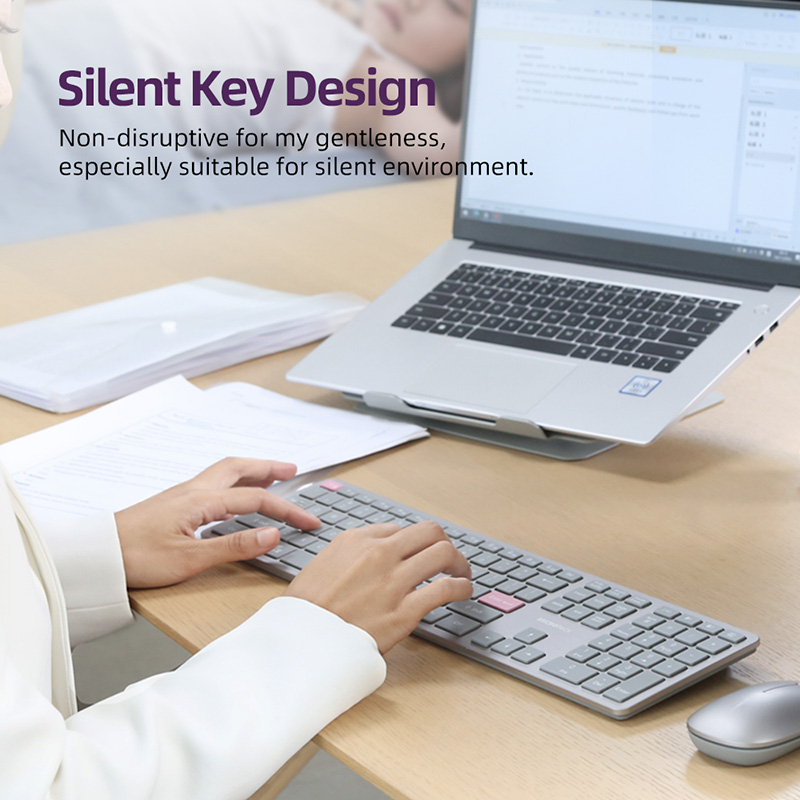 ĐẶC ĐIỂM NỔI BẬT: • Chế độ kép với 3 kênh: Hỗ trợ kết nối không dây & Bluetooth 2.4G, hoạt động với 3 thiết bị (2.4G + BT1 + BT2), chuyển đổi dễ dàng. • Pin sạc: Pin sạc tích hợp, loại bỏ rắc rối khi mua và thay pin mới. • Tiêu thụ điện năng thấp: Trung bình, một lần sạc đầy có thể kéo dài tới 3 tháng. (Thời lượng pin có thể thay đổi tùy theo điều kiện sử dụng và tính toán.) • Nắp phím Silent Scissors: Bàn phím switch cắt kéo có đặc điểm là kiểu dáng mỏng, đơn giản và thoải mái trong môi trường im lặng. Bề ngoài bằng nhôm để thể hiện vẻ ngoài cao cấp. • Tương thích với Mac & Win: Bàn phím được thiết kế để tương thích với Mac & WIN OS, chỉ với một nút chuyển đổi dễ dàng.