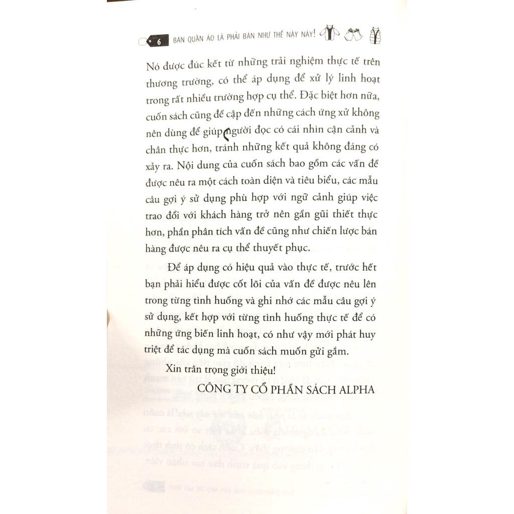 Bán quần áo là phải bán như thế này này! là cuốn sách chứa đựng nhiều điều khác biệt so với các tài liệu hướng dẫn thường thấy. Cuốn sách mô tả một cách toàn diện việc kinh doanh trong lĩnh vưc thời trang với các chiến lược bán hàng cụ thể, thực tế, có tính thực tế rất cao khi áp dụng vào việc đào tạo nhân viên. Cuốn sách kinh doanh này đồng thời cũng đưa ra những hướng dẫn, gợi ý, các mẫu câu sử dụng phù hợp với ngữ cảnh giúp việc trao đổi với khách hàng trở nên gần gũi thuyết phục.