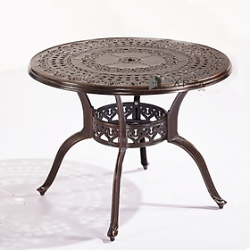 Bàn tiệc BBQ tại nhà nhôm đúc ngoài trời Bàn tròn 1m cho sân vườn sân thượng TE2010-106A – Nội thất CAPTA – Outdoor Dining Table Chất liệu: Nhôm đúc sơn tĩnh điện Kích thước: D1060*H730 mm Màu sắc: Đồng; Trắng Bàn có đường kính 1m, phù hợp bố trí 4 6 ghế ăn. Mặt bàn rộng rãi, dễ dàng bày biện đồ ăn. Chất liệu nhôm đúc cao cấp chống thấm và chịu nhiệt tốt, giúp bàn bền bỉ với thời tiết ngoài trời. Mặt bàn khắc hoa văn tinh xảo, giúp bàn thêm sang trọng cổ điển. Bên cạnh đó, những hoa văn này còn giúp nước không bị tồn đọng sau những cơn mưa, giúp bàn thêm bền đẹp. Chân bàn thiết kế chụm uốn cong cầu kỳ đẹp mắt. Khung bàn tròn chắc chắn, giúp bàn đứng thêm chịu lực và vững chãi. Có thể kết hợp bàn tròn TE2010-106A với ghế CC2016-A tạo thành bộ bàn ghế đồng bộ hoàn hảo.