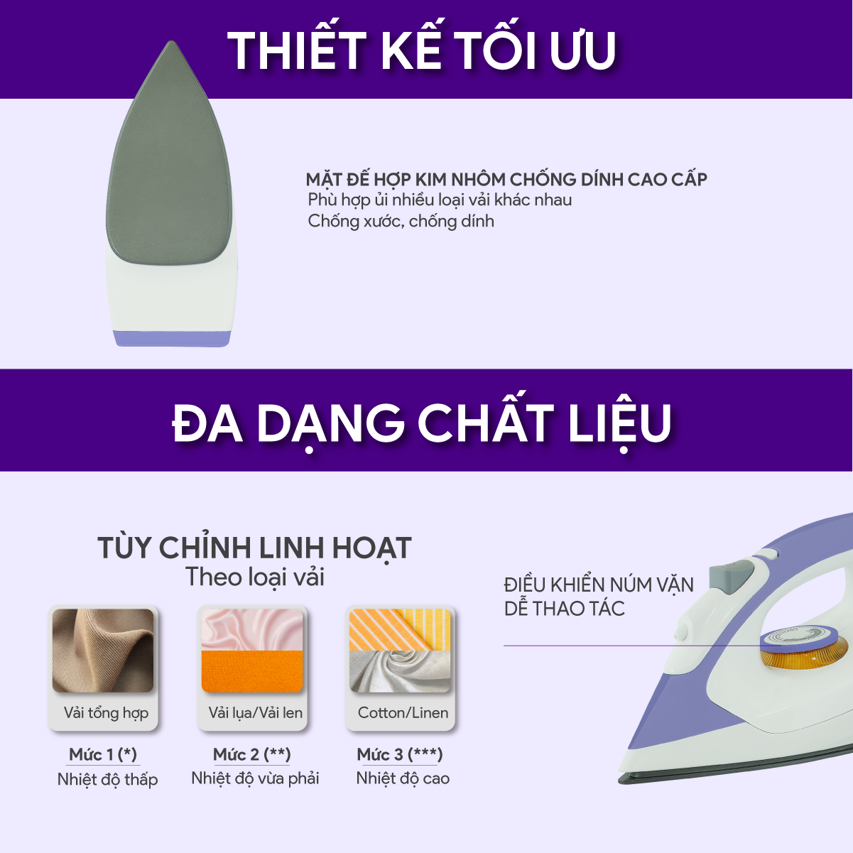 - Công suất: (1100-1300) W - Mặt đế: Hợp kim nhôm chống dính - Điều khiển: Núm vặn - Công suất mạnh mẽ lên đến 1300 W, giúp ủi thẳng quần áo nhanh chóng và