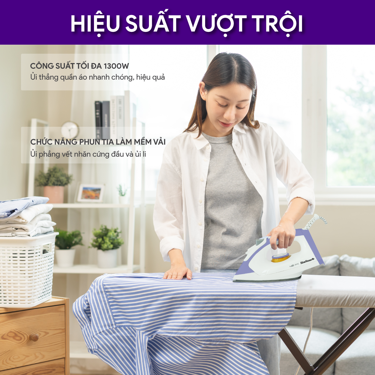- Công suất 1100 - 1300W giúp ủi nhanh và hiệu quả cao. - Tích hợp bình xịt có thể tháo rời làm phẳng nếp nhăn dễ dàng. - Mặt đế kim loại chống dính, gia nhiệt nhanh,
