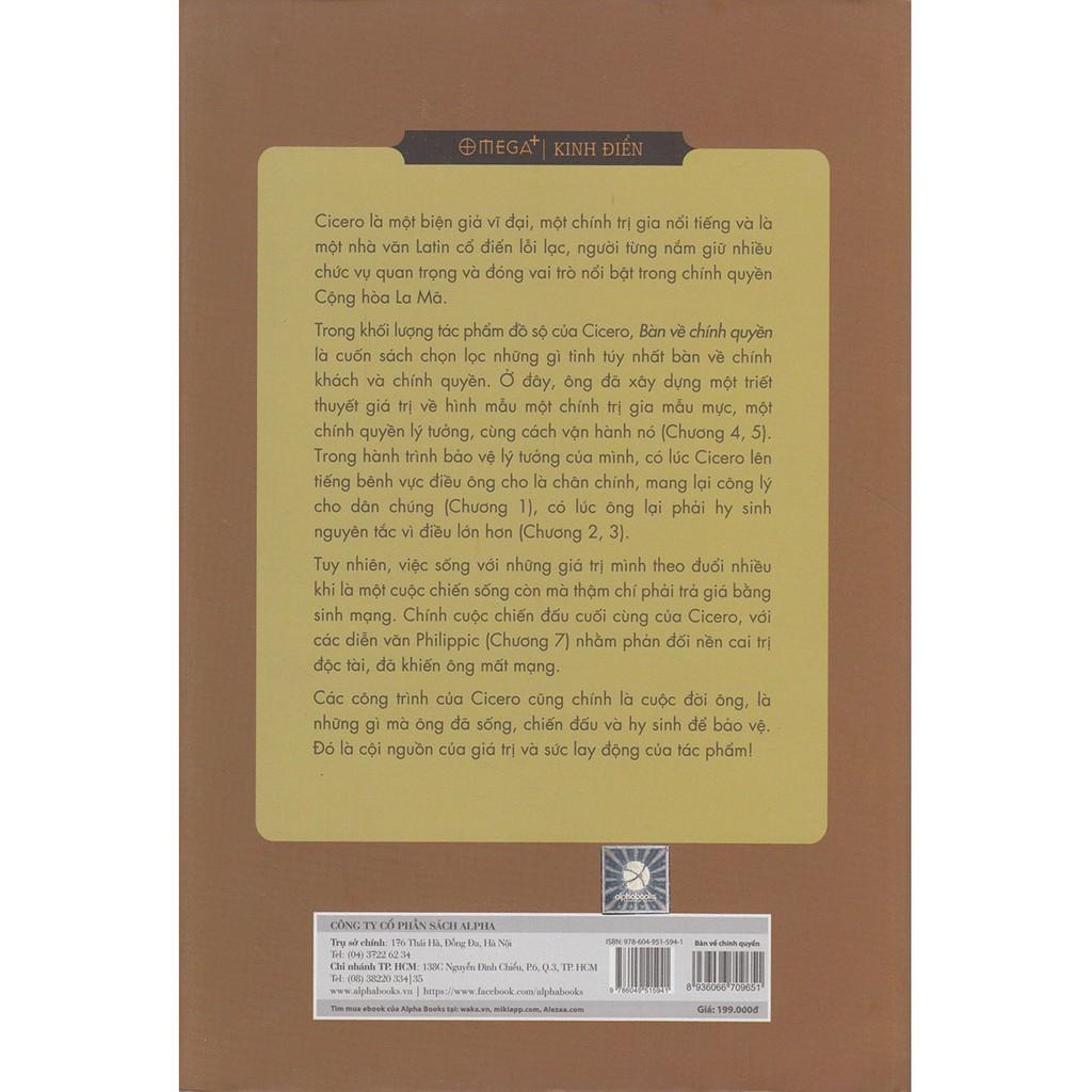 Lần đầu tiên một cuốn sách của triết gia vĩ đại Cicero được phát hành chính thức tại Việt Nam. Bàn về chính quyền là một trong những nền tảng tư tưởng của Phương Tây, cuốn sách nằm trong tủ sách kinh điển của Omega. Thuật cầm quyền có vai trò thiết yếu đối với cuộc sống của chúng ta, và là thứ nghệ thuật cực kỳ phức tạp. Chúng ta sẽ nhận ra độ phức tạp của nó khi xem xét những sai lầm kinh hoàng của những nhà cai trị xuyên suốt các thời đại, và vẫn còn tiếp diễn đến ngày nay. Vì vậy họ cần phải biết rõ hơn về công việc mà họ đang nỗ lực thực hiện, cũng như về thành tựu và sai sót nổi bật trong sự nghiệp của những chính quyền khác trong quá khứ. Về mặt này, chính quyền La Mã cổ đại hết sức phù hợp và không ai ngoài Cicero có thể bàn về nó. Cicero sinh ra tại Arpinium trong một gia đình bản xứ sung túc. Ông được đưa đến Rome để học tập theo định hướng sự nghiệp công, và vào năm 70 TCN ông đã vươn đến địa vị trạng sư hàng đầu ở Rome, nắm giữ nhiều chức vụ quan trọng và đóng vai trò nổi bật trong chính quyền Cộng hòa La Mã. Trong khối lượng tác phẩm đồ sộ của ông, Bàn về chính quyền là cuốn sách chọn lọc những gì tinh túy nhất bàn về chính khách và chính quyền. Bảy tác phẩm được tập hợp trong cuốn sách này diễn giải lòng tin đầy đam mê của ông trong việc hòa hợp quốc gia, chúng thể hiện trọn vẹn quyền lực vững mạnh của ông trong vai trò một biện giả và một tác giả. Các tác phẩm được trình bày dưới hình thức diễn văn và những cuộc thảo luận giả định. Với những hình thức này Cicero có thể thể hiện trọn vẹn trí tuệ, kiến thức và kỹ năng lập luận sắc sảo của mình. Những cuộc thảo luận giả định đầy thú vị xen những câu chuyện có phần châm biếm, hài hước cũng rất cuốn hút và giúp độc giả dễ hình dung, theo dõi. Các công trình của Cicero cũng chính là cuộc đời ông, là những gì mà ông đã sống, chiến đấu và hy sinh để bảo vệ. Đó chính là cội nguồn của giá trị và sức lay động của tác phẩm này. Xin trân trọng gửi đến độc giả cuốn sách này! TÁC GIẢ : Marcus Tullius Cicero Marcus Tullius Cicero (106 – 43 TCN) là một triết gia, chính khách, biện giả La Mã. Cicero sở hữu nhiều kỹ xảo đa dạng và khả năng làm chủ ngôn ngữ Latin đến độ phi thường. Ông đã viết một lượng lớn tác phẩm về lí tưởng và thực hành thuật hùng biện, về tôn giáo, cũng như về triết học đạo đức và chính trị. Tác giả: Marcus Tullius Cicero NXB: NXB Hồng Đức Năm XB: 05-2017 Trọng lượng (gr): 560 Kích thước: 16 x 24 Số trang: 544 Hình thức: Bìa Cứng Ngôn ngữ: Sách tiếng Việt