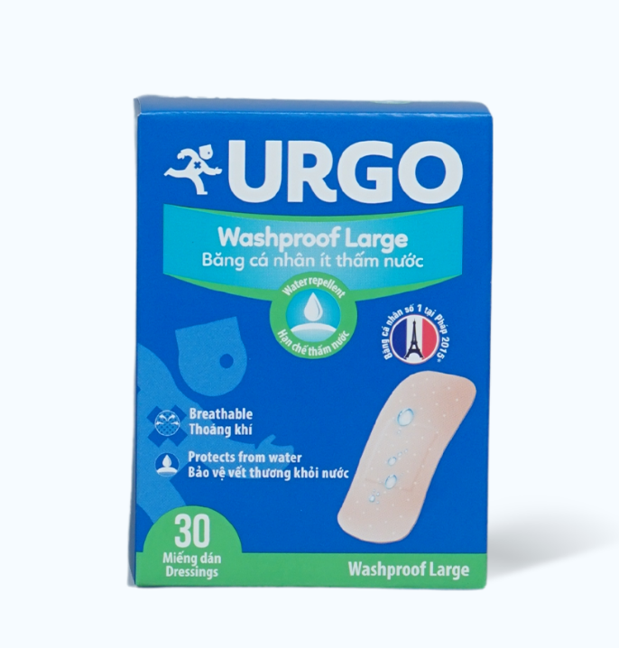 ✨Băng cá nhân ít thấm nước URGO Washproof Large bảo vệ vết thương khỏi nước 3.8cm x 7.2cm (30 miếng)