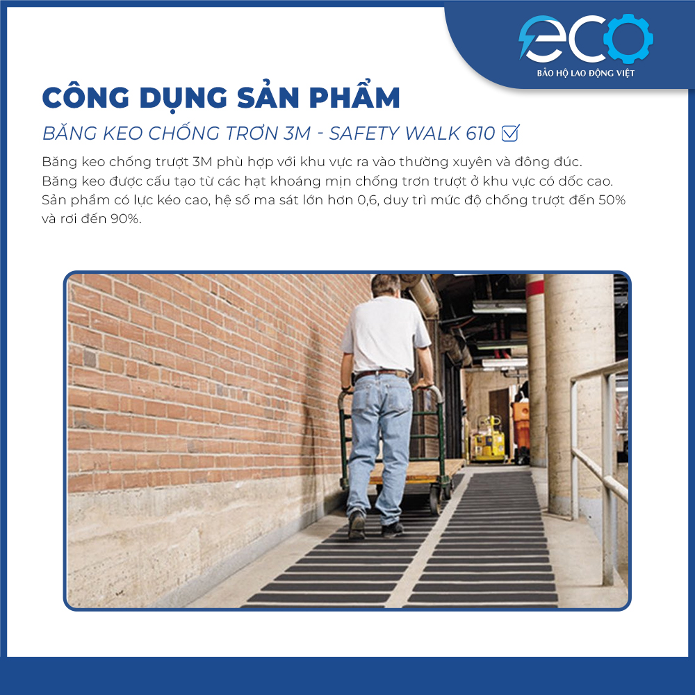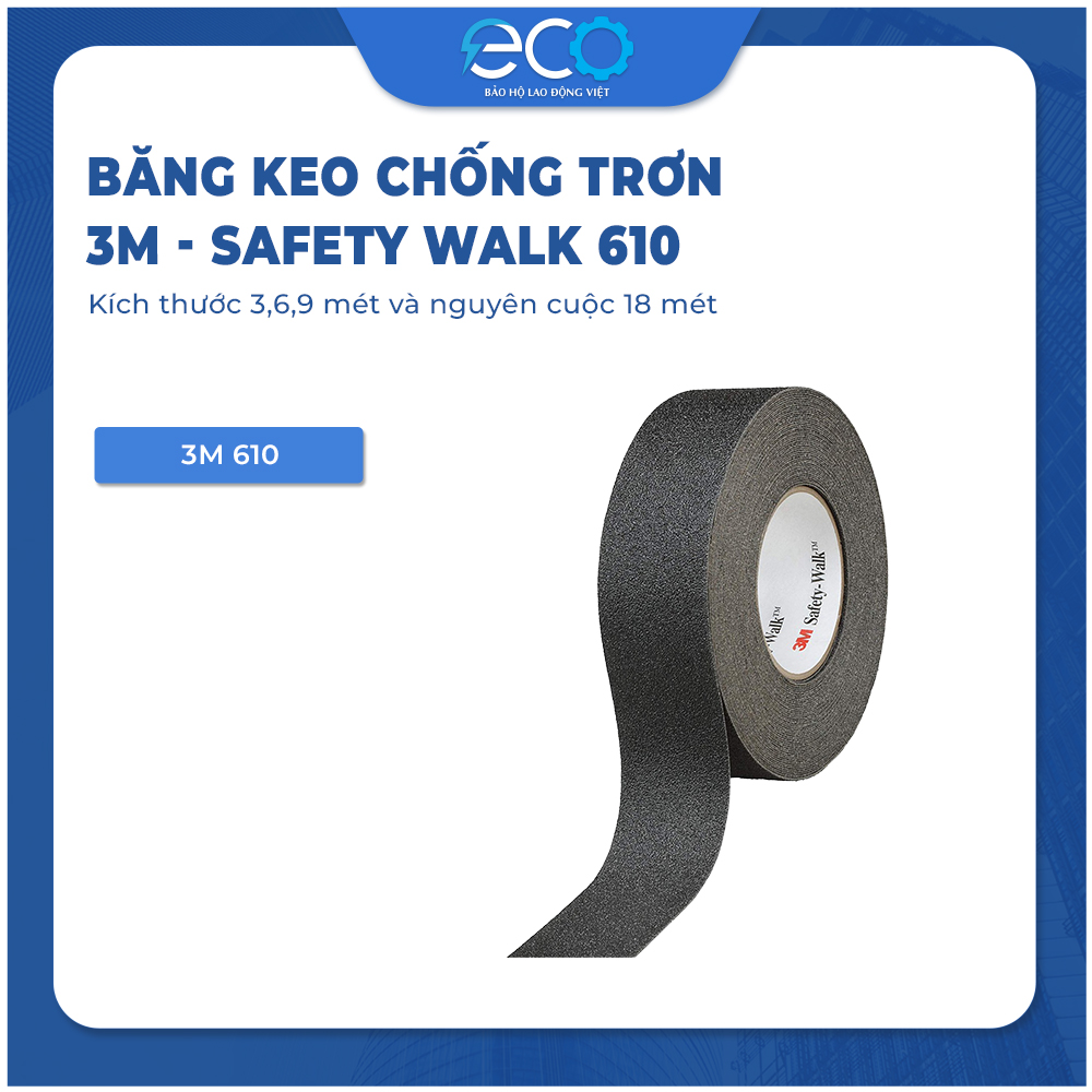 - Keo dính: Keo acrylic bám dính chắc chắn trên nhiều bề mặt ️ Ưu điểm của băng keo chống trơn 3M Safety-Walk 610 Chống trơn trượt hiệu quả cao: Bề mặt hạt nhám giúp tăng độ bám cho giày dép, giảm nguy cơ trượt ngã. Độ bền cao: Chống chịu tốt với nước, dầu, hóa chất và điều kiện môi trường khắc nghiệt. Dễ dàng sử dụng: Chỉ cần bóc lớp keo và dán trực tiếp lên bề mặt cần chống trơn. Ứng dụng đa dạng: Dùng trong nhà, ngoài trời, cầu thang, sàn nhà xưởng, khu vực có độ ẩm cao như hồ bơi, tàu thuyền. ️ ĐẶC ĐIỂM NỔI BẬT