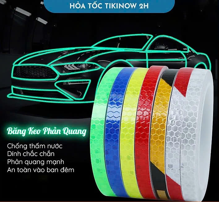 - Băng keo phản quang chống nước, có thể dùng ngoài trời, dán ngoại thất oto. Băng keo dạ quang chỉ nên sử dụng trong nhà. Kích thước: kích thước được ghi ở phần chọn sản phẩm. Ví dụ 1cm*8m nghĩa là băng keo có bề ngang rộng 1cm, dài tổng cộng 8m.