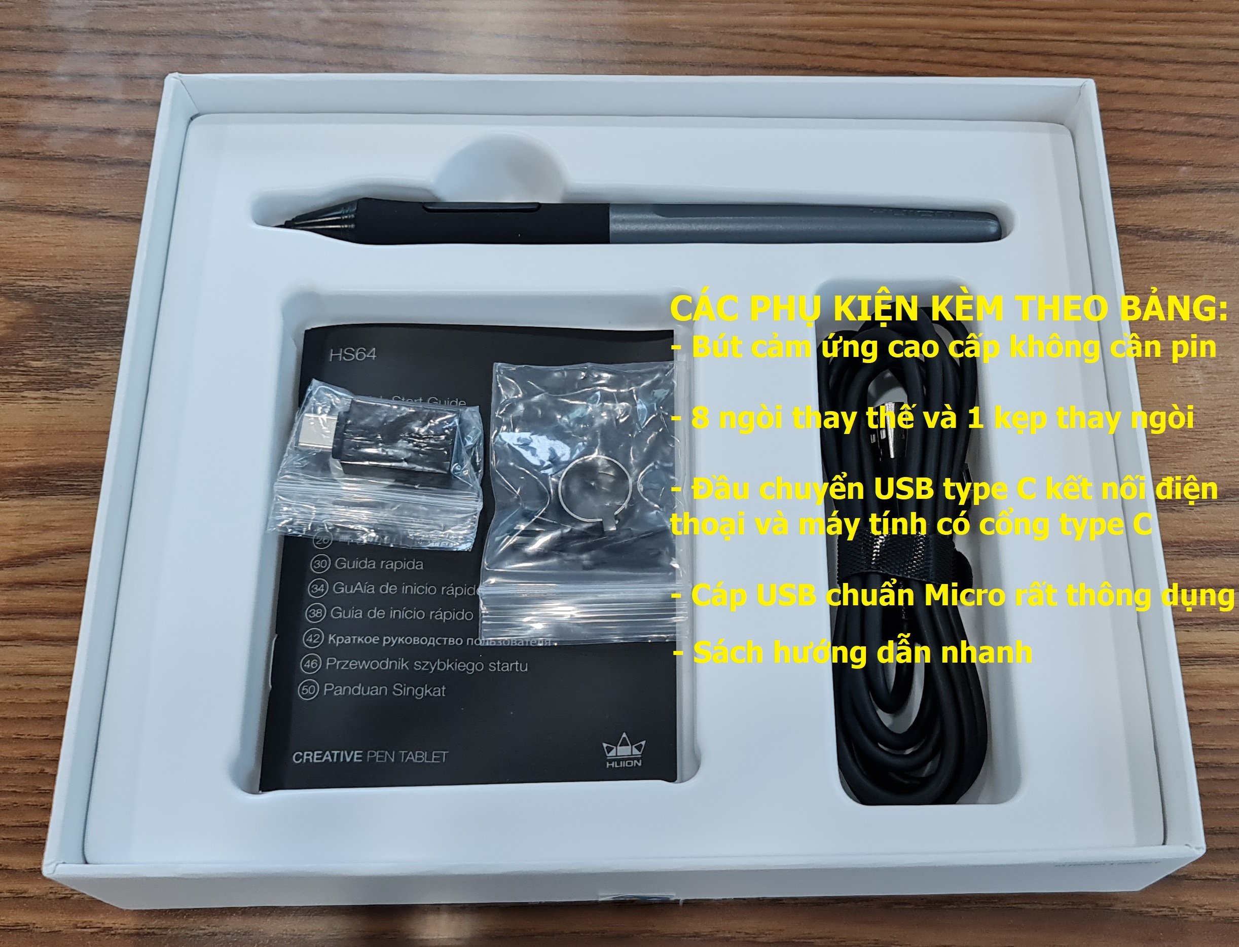 Mua tại TiktokHÔNG SỐ KỸ THUẬT CỦA BẢNG VIẾT ĐIỆN TỬ HS64 iPro Màu sắc Đen Kích thước 200 x 166 x 8mm Diện tích sử dụng của bảng 160 x 102mm Trọng lượng 258g Cổng kết nối Micro USB Bút cảm ứng PW100 Công nghệ bút Cảm ứng từ, không dùng pin Cảm biến lực ấn bút 8192 levels Độ phân giải cảm biến 5080 LPI Khoảng cách nhận biết bút 10mm Tốc độ cảm biến > 233PPS Độ chính xác ±0.3mm Phím tắt 4 phím tắt có thể được lập trình Hỗ trợ hệ điều hành Windows 7 trở lên, macOS 10.12 trở lên, Android 6.0 trở lên Quy cách tiêu chuẩn Bảng viết điện tử x1, Bút kỹ thuật số x1, Cáp Micro USB, Chuyển đổi cổng USB cho điện thoại x1, Ngòi bút x8, Kẹp ngòi bút x1, Sách hướng dẫn sử dụng x1. Phần mềm hỗ trợ giảng dạy i-Pro5 phiên bản mới nhất năm 2021, bản quyền vĩnh viễn.