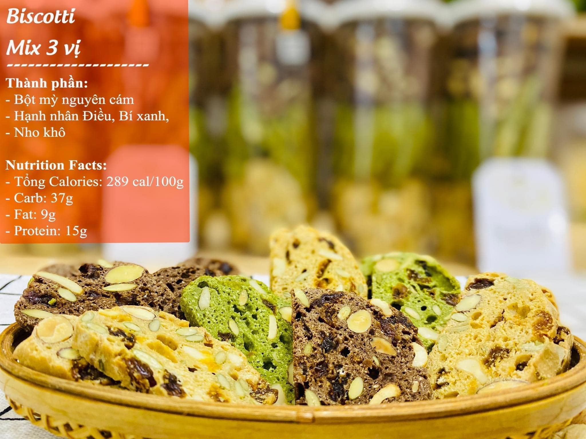 BÁNH BISCOTTI: - Làm từ bột mì nguyên cám và hạt dinh dưỡng - Thơm ngon chuẩn vị biscotti Ý - Phù hợp ăn kiêng, eat clean, ăn vặt healthy - Món ăn pre-workout lý