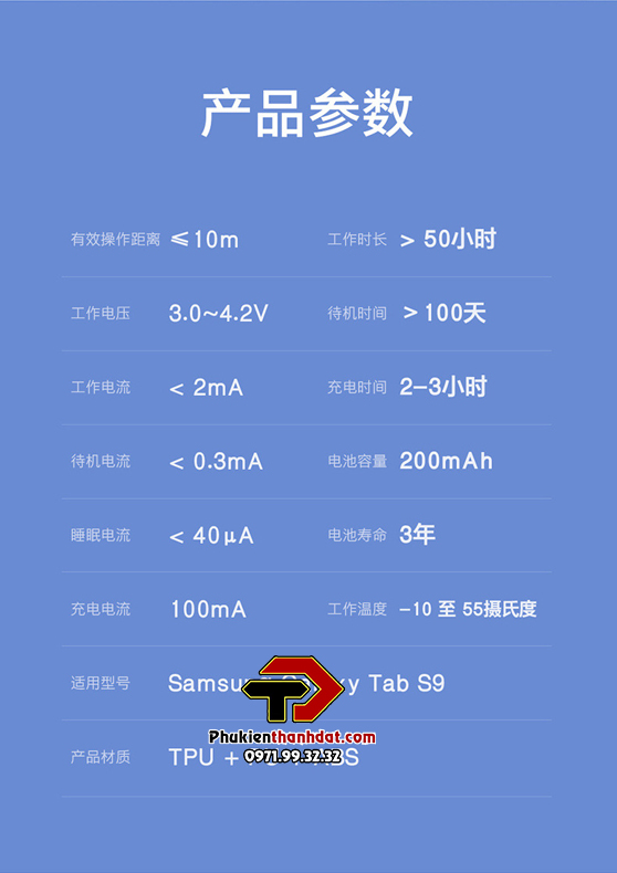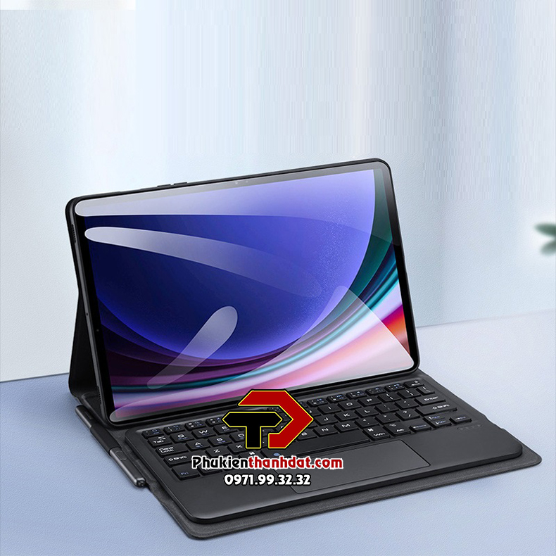 Bộ sản phẩm bao gồm: Vỏ bao da, bàn phím bluetooth có bàn di chuột, dây sạc cho bàn phím. Bán kính kết nối: < 10m Thời gian sạc: 2-3 giờ Dung lượng pin Lithium: