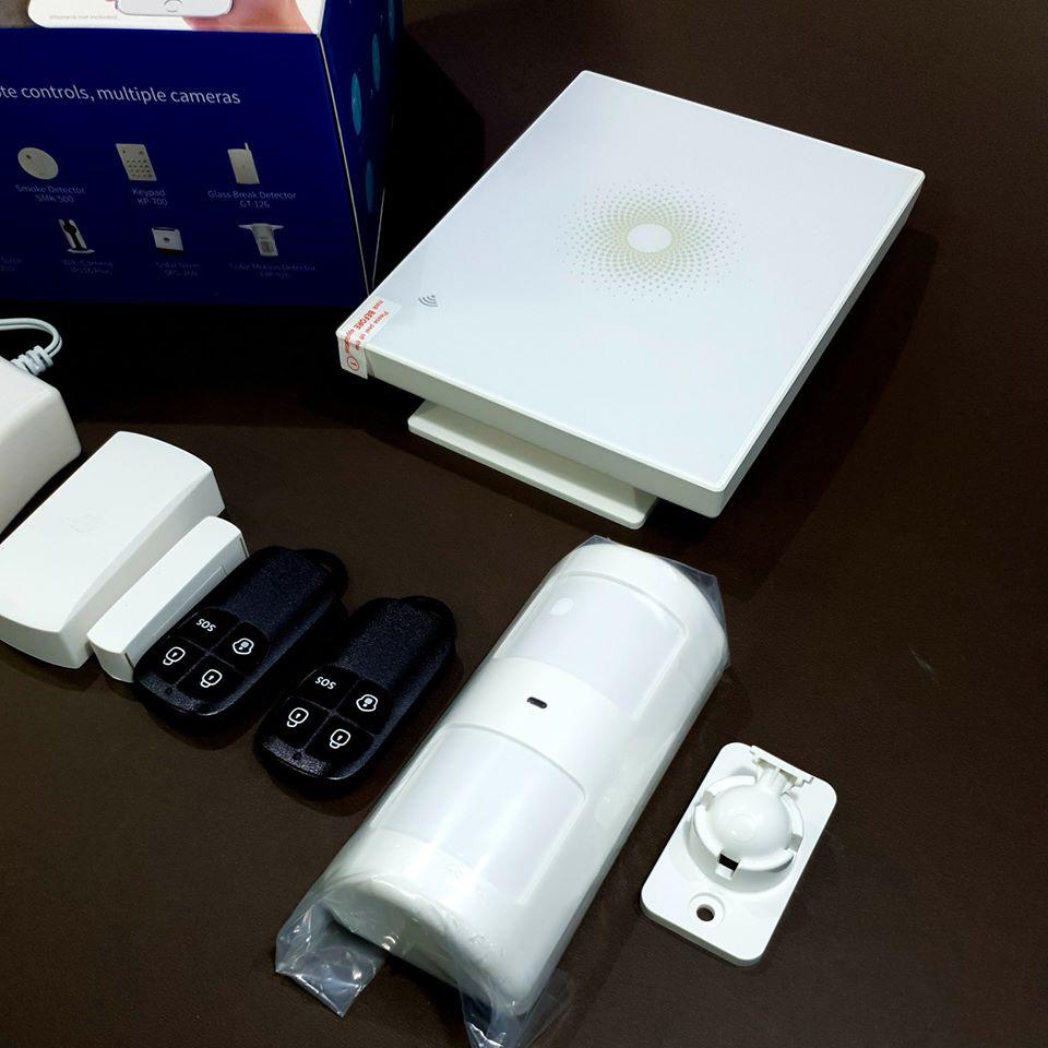 Bộ báo động chống trộm qua smartphone gồm một 1 bộ trung tâm, 1 cảm biến chuyển động hồng ngoại, 1 cảm biến má từ mở cửa, 2 remote điều khiển và 1 loa báo