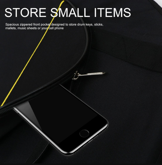 - Túi trước có khóa kéo rộng rãi được thiết kế để cất giữ các phím trống, gậy, vồ, bản nhạc hoặc điện thoại di động của bạn.