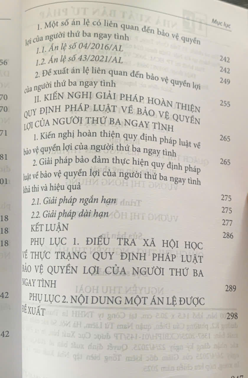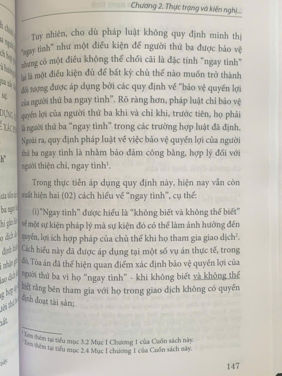 Do đó, việc thể một số trường hợp còn chưa thống nhất. Do đó, việc tiếp tục nghiên cứu lý luận và thực tiễn của các khía cạnh pháp lý về bảo vệ quyền lợi của người thứ ba ngay tình là hết sức cần thiết, không chỉ cho người nghiên cứu, người học luật mà cả những người làm thực tiễn, như Thẩm phán, Luật sư, Công tố viên, Điều tra viên... và những người tham gia xây dựng chính sách, pháp luật.