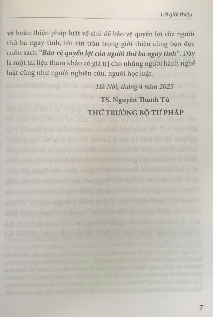 Bảo vệ quyền lợi của người thứ ba ngay tình (sách chuyên khảo) Tác giả: Ts. Đặng Thanh Hoa (chủ biên) Nhà xuất bản: Tư Pháp Công ty phát hành: NXB Tư Pháp Ngày xuất