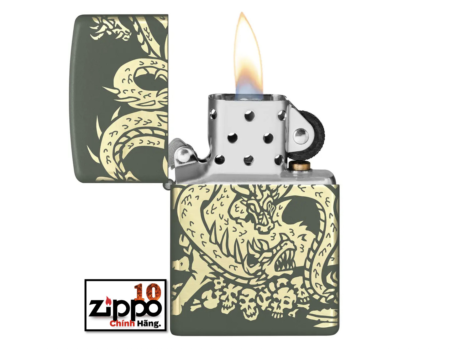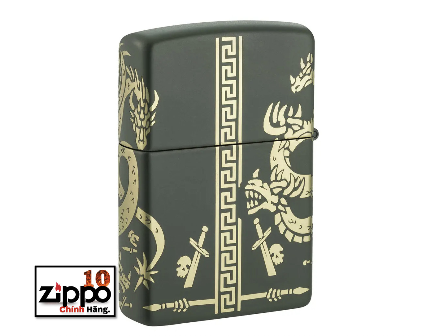 Mẫu Green Matte mạnh mẽ này đánh dấu sự ra mắt của phương pháp khắc Laser 360° sắc nét và chính xác trên các mẫu đế mờ đặc trưng của chúng tôi – một phương pháp xử lý trước đây chỉ dành riêng cho bề mặt trước. Tác phẩm được chỉ huy bởi một con rồng nhiều đầu trên đỉnh tàn tích của những kẻ thách thức nó, được mô tả bằng tông màu đồng sáng bóng. Được đóng gói trong một hộp đựng dạng quà tặng. Để tối ưu hiệu suất, hãy dùng nhiên liệu bật lửa của Zippo.