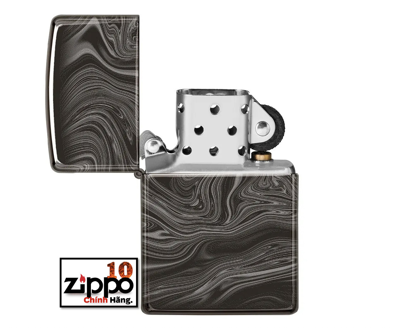 Thiết kế mới hoa văn vân đá cẩm thạch được tạo trên chiếc bật lửa Zippo đồng thau, nền mạ High Polish Black bằng qui trình in hình ảnh màu 360° của Zippo. Được đóng