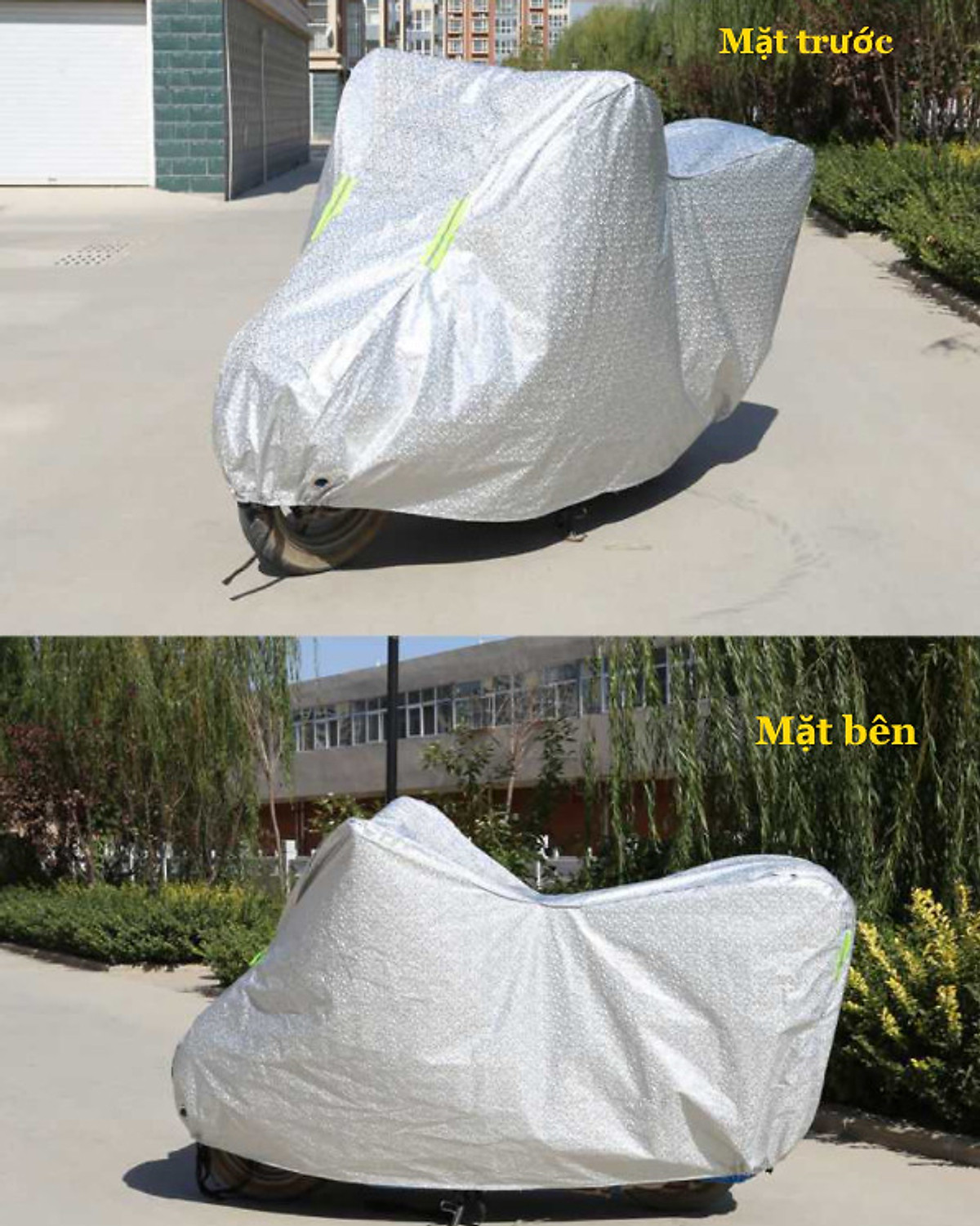 • Có Viền Bao Quanh Phân Biệt Che Trước/Sau. Sản phẩm có gắn vải phản quang trước và sau xe, giúp ích việc đậu đỗ xe ngoài trời, trên lề đường cả ban ngày và ban đêm.
