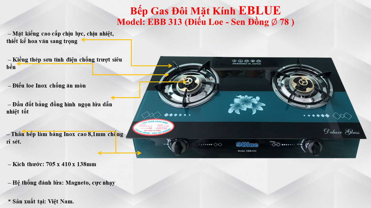 * Mặt kiếng cao cấp chịu lực, chịu nhiệt, thiết kế hoa văn sang trọng; - Thân bếp bằng inox, cao 100 mm; - Kiềng thép sơn tĩnh điện, có chắn gió; - Điếu loe