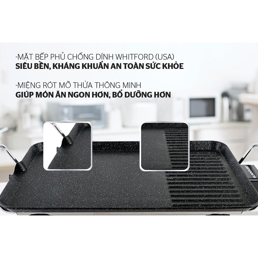 ĐẶC ĐIỂM NỔI BẬT - Cấu tạo bếp nướng thông minh, dễ dàng tháo lắp vệ sinh sau khi sử dụng - Bề mặt phủ chống dính đá hoa cương Whitford – USA siêu bền,