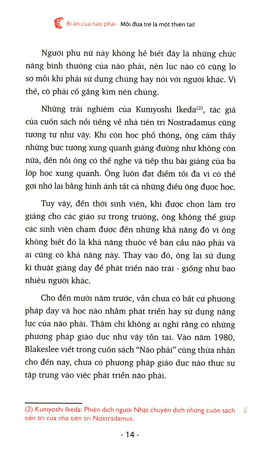 Mỗi Đứa Trẻ Là Một Thiên Tài! Những Thành Tựu Của Phương Pháp Tiếp Cận Mới Nhất Trong Giáo Dục Đối với trẻ nhỏ việc giúp bé phát triển khả năng tư duy sáng tạo là điều rất quan trọng, vì vậy cha mẹ cần quan tâm giúp trẻ rèn luyện kích thích hoạt động của não phải để bồi dưỡng cho trẻ khả năng tư duy sáng tạo. Bởi lẽ việc phát triển não phải cho trẻ không phải chỉ phát triển về cảm xúc, về sự sáng tạo mà những kết quả đó sẽ giúp ích rất nhiều cho sự phát triển toàn não bộ. Khi được giáo dục đúng cách, não phải sẽ phát triển và tạo sự liên kết với não trái một cách tốt nhất. Để giúp các bậc cha mẹ dễ dàng hình dung về dạng năng lực và khả năng sáng tạo của các bé nay Viện Giáo dục Trẻ em Shichida Nhật Bản sẽ gửi đến các bậc phụ huynh những kiến thức về khả năng tư duy của con bạn cũng như những kỹ năng mà bé có thể tự học hỏi, sáng tạo, và phát triển trong chính bộ não tí hon của mình. Điều quan trọng nhất trong giáo dục không phải nhồi nhét kiến thức mà là khơi gợi tài năng thiên bẩm mà mỗi bé có ngay từ khi sinh ra. Để đạt được điều này, ba mẹ cần tạo môi trường tốt nhất cho sự phát triển của bé giàu tính tương tác và giáo dục. Bằng cách kết hợp sức mạnh của não trái, Phương pháp Shichida hướng đến mục tiêu khơi dậy khả năng của trẻ một cách cân bằng được gọi là “giáo dục não toàn diện”. Những khả năng như “cảm hứng” và “sáng tạo” được điều khiển bởi những chức năng của não phải. Não phải tư duy bằng hình ảnh và có khả năng nhớ những gì chúng ta thấy chỉ bằng một cái nhìn. Điều này minh họa cho trí tưởng tượng phong phú. Não trái tư duy bằng ngôn ngữ, chi phối việc phân tích và tư duy lôgic của chúng ta. Thật đáng tiếc, chúng ta thường chỉ sử dụng não trái, còn não phải thường ở trong trạng thái ngủ. Những bé được dạy đúng cách để sử dụng não phải từ nhỏ sẽ có thể duy trì các khả năng này thậm chí sau khi bé lớn lên. Có một thực tế là mọi đứa trẻ đều được sinh ra cùng vô vàn tài năng tiềm ẩn. Song những tiềm năng đó sẽ không thể nảy mầm nếu không được tác động đúng lúc và đúng cách. Không ai khác, chính cha mẹ là người khơi dậy những tố chất thiên tài của con mình. Không đơn giản là một cuốn sách nuôi dạy con cái thông thường, mà còn có rất nhiều chủ đề thú vị, bí ẩn về năng lực tiềm ẩn của não phải. Qua đó cuốn sách cũng kết hợp nhiều câu chuyện thực tế mà các bé đã được giáo dục qua phương pháp Shichida “Bí Ẩn Của Não Phải” đem đến một triết lí giáo dục lành mạnh, nhân văn mà vẫn rất kỉ luật, nghiêm khắc. Ngoài phần nội dung ra cuốn sách còn có những hình ảnh cụ thể, sinh động, dễ hiểu cùng với những câu chuyện thực tế mà giáo viên tại học viện Shichida đã kể lại rằng: “Ông nội của T mắc bệnh ung thư. Cậu bé nghe được điều này khi bác sĩ giải thích tình trạng bệnh của ông với mẹ. T có khả năng chữa lành cho người khác thông qua việc tưởng tượng mình biến thành một người tí hon và đi vào trong cơ thể của họ để chữa lành những bộ phận bị đau. Mỗi lần đến thăm ông trong bệnh viện, T đều tưởng tượng mình đang đi vào cơ thể của ông và tiêu diệt hết vi khuẩn. Các tế bào ung thư nhỏ lại dần dần. Em T đã làm như vậy không chỉ cho ông nội mà còn cho các bệnh nhân khác trong cùng phòng và thậm chí một số bệnh nhân bị ốm nặng, thật ngạc nhiên khi tất cả những người đó đã đủ khỏe để trở về nhà”. Cuốn sách đem đến triết lí giáo dục lành mạnh, nhân văn, coi trọng và tôn vinh mọi đứa trẻ. Nó cũng thức tỉnh cha mẹ Việt tận dụng những năm tháng đầu đời - khoảng thời gian duy nhất chúng ta có thể nắm tay trẻ - để quan tâm hơn đến việc nuôi dạy và giúp con có nền tảng phát triển tốt nhất. Không phải việc giáo dục bằng não phải theo phương pháp Shichida mang lại cho bạn một đứa trẻ thiên tài, mà luôn luôn có một thiên tài trong mỗi đứa trẻ nếu chúng ta biết cách kích thích não phải đúng cách.