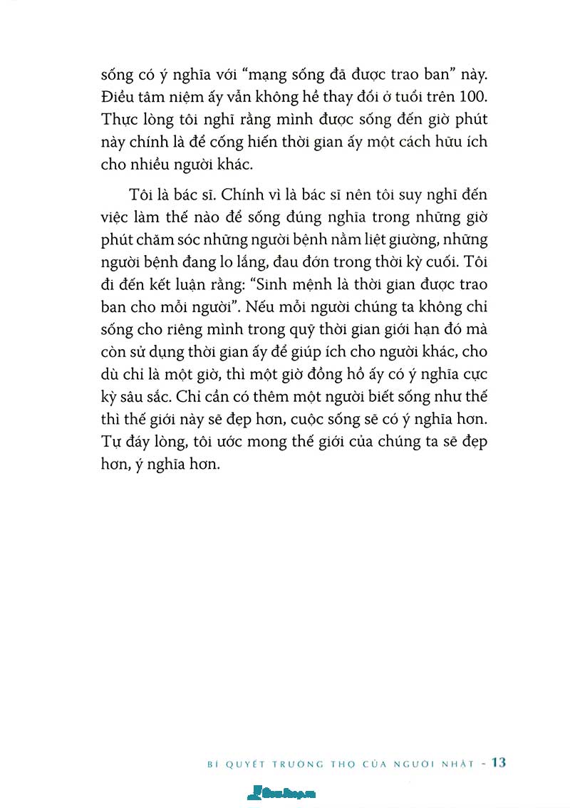 Cố bác sĩ Shigeaki Hinohara sống thọ 106 tuổi và ông vẫn liên tục hành nghề, không nghỉ hưu đến tận ngày 18/7/2016, ngày ông mất. Tựa của quyển sách Bí Quyết Trường Thọ Của Người Nhật có lẽ khiến bạn nghĩ đến việc ông sẽ liệt kê những việc bạn nên làm và không nên làm để có tăng tuổi thọ. Đúng là thế, nhưng quyển sách đặc biệt ở chỗ đó không phải là lý thuyết suông, không phải những lời sáo rỗng mà bạn đôi khi đọc được đâu đó trên mạng, mà đây là những lời khuyên đã được viết bởi một vị bác sĩ già khi bước qua tuổi 90, người đã trải qua những dấu mốc mang tính lịch sử của Nhật Bản và Thế Giới, từng chứng kiến hơn 4000 bệnh nhân giã từ cuộc sống. Đó là tinh hoa từ những kinh nghiệm quý báu khi ông c.hữa ị cho bệnh nhân, khi ông lắng nghe họ và cả từ những sai lầm mà ông đã phạm phải bởi sự hiếu thắng khi còn trẻ của mình.
