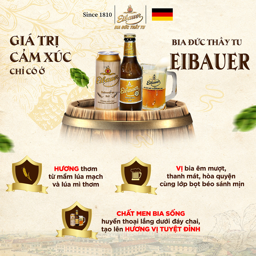 -Trong mỗi lon hay chai Bia Đức Eibauer có chứa con men sống được lên men thứ cấp, không sử dụng chất bảo quản vì thế sẽ giữ được phần lớn các vi sinh vật có lợi cho sức khoẻ và điều quan trọng là tạo ra một thứ hương vị đậm đà thơm, ngọt ngào, đầm ấm,êm trôi. Và theo từng hớp, từng hớp Eibauer. Cảm xúc của bạn được đong đầy, hứng khởi trào dân.