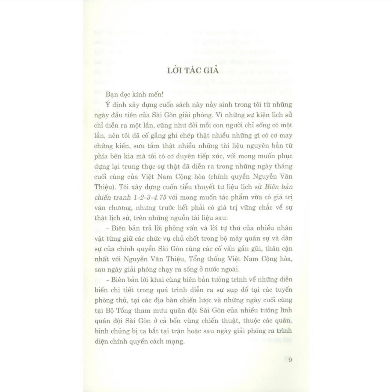 Biên Bản Chiến Tranh 1-2-3-4.75   Công ty phát hành: Thái Hà Ngày xuất bản : 04/2020 Loại bìa Bìa mềm Khổ : 24x 16 Nhà xuất bản Nhà Xuất Bản Chính Trị Quốc Gia