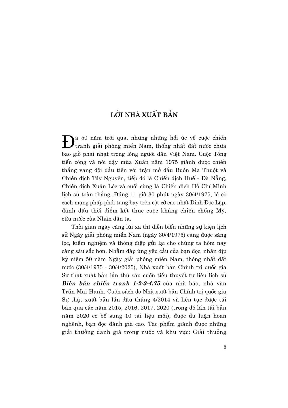 Nhằm đáp ứng yêu cầu của bạn đọc, nhân dịp kỷ niệm 50 năm Ngày giải phóng miền Nam, thống nhất đất nước (30/4/1975 - 30/4/2025), Nhà xuất bản Chính trị quốc gia Sự thật xuất bản lần thứ sáu cuốn tiểu thuyết tư liệu lịch sử Biên bản chiến tranh 1-2-3-4.75 của nhà báo, nhà văn Trần Mai Hạnh.