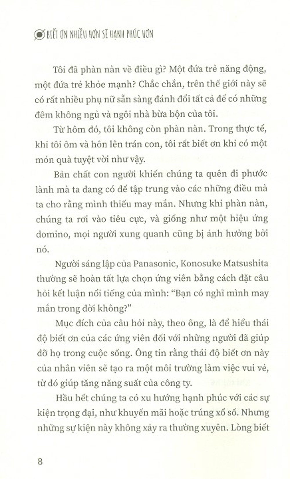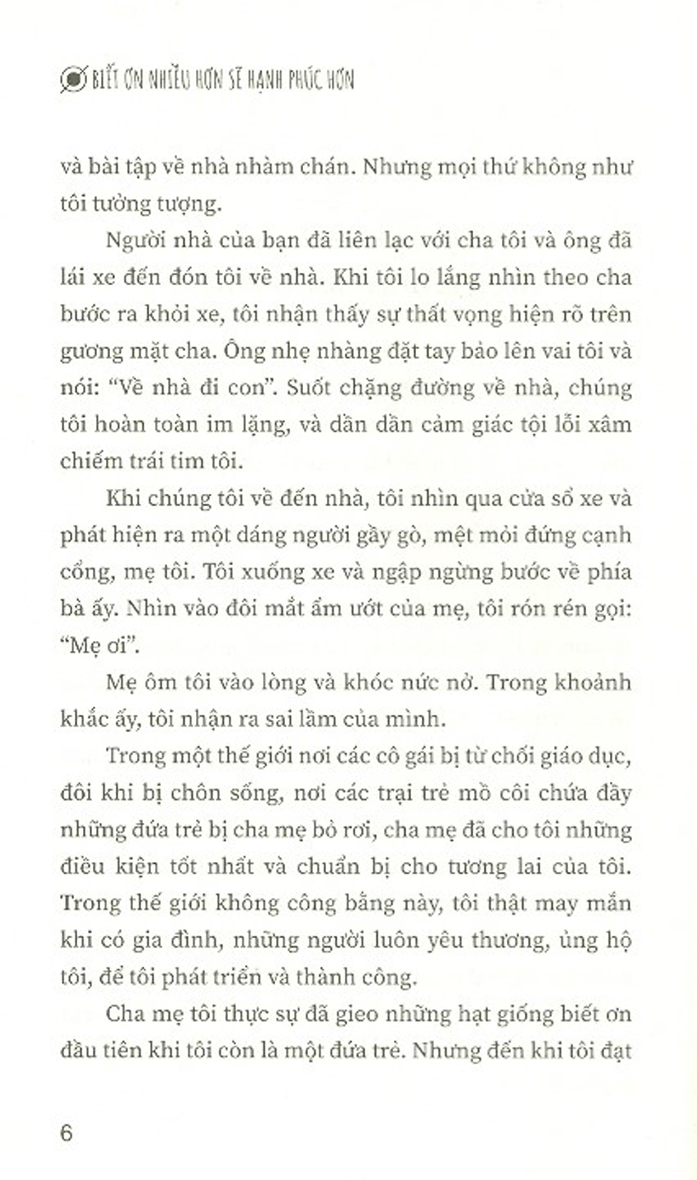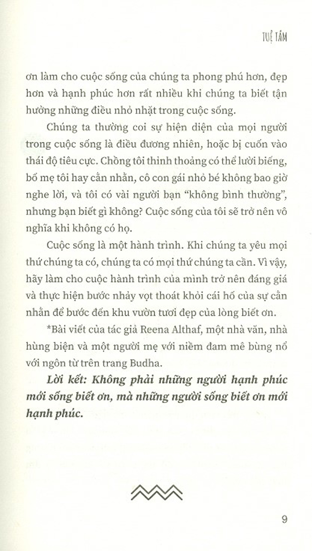 Biết Ơn Nhiều Hơn Sẽ Hạnh Phúc Hơn GIỚI THIỆU SÁCH: Có lúc nào bạn chợt nghĩ: sao mình xấu thế? Sao chân mình ngắn thế? Sao mình không chơi thể thao giỏi? Sao bố mẹ mình không giàu có? Chúng tôi chắc chắn rằng, ai trong đời cũng có đôi lần oán tránh số phận, oán trách chính mình vì không bằng người khác, không giống như người khác. Bạn thân mến, những suy nghĩ như vậy chỉ khiến chúng ta sống trong lo sợ, buồn bực. Và cảm thấy chán ghét cả thế giới, cảm thấy cuộc sống thật chán nản và khó khăn. Bạn thân mến, bạn hãy thử nghĩ mà xem, tuy chân bạn không dài nhưng ngoài kia còn rất nhiều người phải lắp chân giả, bố mẹ bạn không giàu, nhưng ngoài kia vẫn còn nhiều người không biết bố mẹ mình là ai… Hãy biết ơn vì ít nhất bạn đang sống một cách bình thường, có cuộc sống bình thường hoặc ít nhất hãy biết ơn vì bạn được sống. Khi bạn học được cách biết ơn, bạn sẽ cảm thấy hạnh phúc. Lúc đó bạn sẽ nhận ra: Hạnh phúc không hề xa xỉ, hạnh phúc là khi biết ơn cuộc đời, và mọi người. Biết Ơn Nhiều Hơn Sẽ Hạnh Phúc Hơn là lời nhắn nhủ chúng tôi dành cho bạn. Biết ơn bạn vì đã mua và lan tỏa cuốn sách này. Thực hành lòng biết ơn là về việc buộc bản thân phải chấp nhận những điều trong cuộc sống mà chúng ta biết là tốt cho chúng ta. Thay vào đó, nó đánh thức chúng ta về khả năng thay đổi tích cực, sống một cách có ý nghĩa hơn. Tình yêu nên được coi như là một vụ kinh doanh, nhưng mọi vụ kinh doanh đều có những điều khoản và đồng tiền của riêng nó. Và trong tình yêu, đồng tiền là đức hạnh. Bạn yêu người ta không phải vì điều bạn làm cho họ, mà là điều họ làm cho bạn. Bạn yêu người ta vì những giá trị và đức hạnh mà họ đạt được trong tính cách của mình.