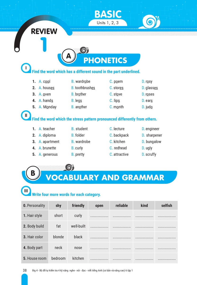 - Nội dung được biên soạn một cách khoa học, theo khung chương trình mới nhất của Bộ Giáo dục và Đào tạo Big 4 - Bộ đề Tự kiểm tra 4 kỹ năng NGHE – NÓI – ĐỌC – VIẾT được biên soạn theo chương trình mới của Bộ Giáo Dục và Đào Tạo. Đây là nguồn tài liệu hữu ích cho giáo viên, phụ huynh và các em học sinh bên cạnh bộ sách giáo khoa cơ bản. Cấu trúc của mỗi Unit gồm 6 phần A. Phonetics B. Vocabulary And Grammar C. Reading D. Speaking E. Listening F. Writing