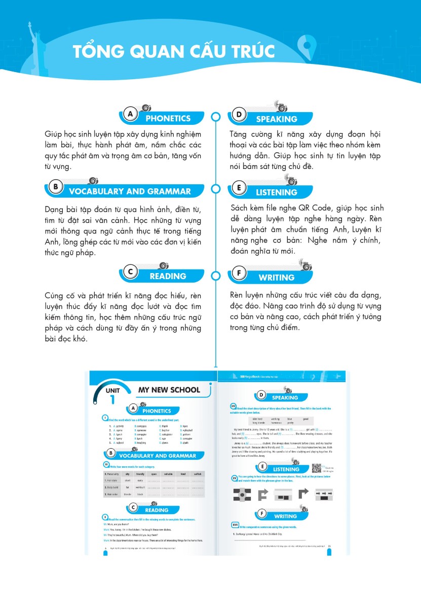 - Bài tập rèn luyện đa dạng, cơ bản và nâng cao Bài tập được phân chia theo 2 cấp độ, cơ bản và nâng cao. Hệ thống bài tập luyện 4 kỹ năng cơ bản giúp các em ôn tập kiến thức trên lớp; bài tập mở rộng, nâng cao để các em rèn luyện và làm quen với các kì kiểm tra, đánh giá. Các bài tập về 4 kỹ năng được liên kết với nhau theo logic bài học giúp cảm em cảm thấy tự tin và phát triển toàn diện kỹ năng nghe, nói, đọc, viết tiếng Anh
