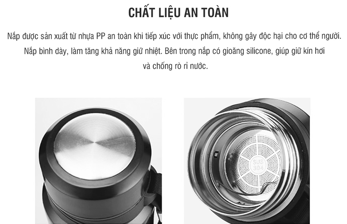 Nắp được sản xuất từ nhựa PP, an toàn cho sức khỏe. Phần lọc tiện dụng có thể giúp người dùng khi uống không bị lợn cợn.