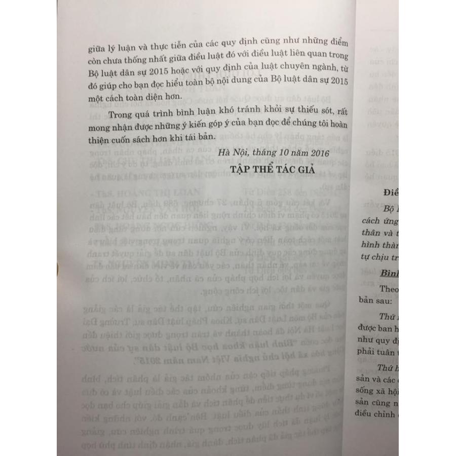 Cuốn sách ra đời nhằm đáp ứng nhu cầu tìm hiểu của bạn đọc về Bình luận khoa học bộ luật dân sự 2015 của nước Cộng Hòa Xã Hội Chủ Nghĩa Việt Nam. Với kết cấu gồm 6 phần 27 chương, 698 điều Bộ luật dân sự 2015 có phạm vi điều chỉnh rộng liên quan đến hầu hết các lĩnh vực của đời sống xã hội. Vì vậy, nghiên cứu nội dung từng điều luật một cách toàn diện có ý nghĩa quan trọng trong việc hiểu, bình luận và áp dụng đúng các quy định của Bộ luật Dân sự để giải quyết tranh chấp về tài sản, về nhân thân, các yêu cầu về việc dân sự bảo đảm được quyền và lợi ích hợp pháp của cá nhân, tổ chức, lợi ích của quốc gia và dân tộc, lợi ích cộng cộng.
