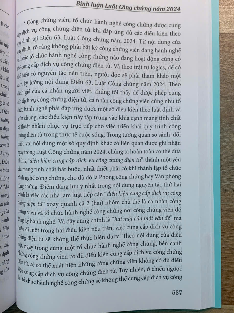 Nhằm cung cấp cho độc giả một góc nhìn toàn cảnh các quy định của Luật Công chứng năm 2024 trước những thay đổi nhanh chóng của thực tiễn cuộc sống cũng như việc sửa đổi, bổ sung rất nhiều đạo luật có liên quan trực tiếp hoặc gián tiếp đến hoạt động này, Nhà xuất bản Tư pháp xuất bản cuốn “Bình luận Luật Công chứng năm 2024”. Dưới nhãn quan của công chứng viên, các tác giả đã phân tích, bình luận một số nội dung của Luật chủ yếu dựa trên kinh nghiệm hành nghề thực tế của bản thân, yêu cầu, đòi hỏi khách quan của cuộc sống được đặt trong tương quan so sánh với nội dung những văn bản quy phạm pháp luật điều chỉnh một số lĩnh vực có liên quan mật thiết đến hoạt động công chứng.