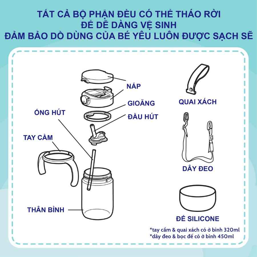 - Ống hút, gioăng, bọc đế: -20°C đến 140°C (silicone) Mỗi bộ phận của sản phẩm được Richell lựa chọn, sản xuất bằng các chất liệu khác nhau vì chúng có các đặc tính phù hợp với yêu cầu sử dụng. Shop không có dịch vụ in/khắc tên lên sản phẩm. ⍣Tiệt trùng: tia UV, hơi nước, trụng nước sôi, dung dịch vệ sinh bình, lò vi sóng (trừ thân bình),...(không quá giới hạn chịu nhiệt). Tất cả các bộ phận của bình đều có thể tháo rời hoàn toàn giúp ba mẹ dễ dàng vệ sinh mọi ngóc ngách. Đảm bảo đồ dùng của bé yêu luôn sạch sẽ, tiệt trùng. ̀ ̂́ ́ ̣̂ ̉ phù hợp với bé từ 6 tháng tuổi. ⍣ Thân bình làm bằng chất liệu ̛̣ (PCT) trong suốt như thủy tinh để mẹ dễ dành quan sát lượng thức uống trong bình. Dễ dàng vệ sinh nhờ phần lòng bình láng mịn. Có vạch chia dung tích thuận tiện cho mẹ theo dõi sức uống của con. ̛̣ - ký hiệu PCT là loại nhựa được đánh giá là một trong những loại nhựa an toàn, không chứa BPA (BPA Free) tức là không chứa các chất gây ung thư hay các thành phần hóa học gây hại đến sức khỏe con người, đặc biệt là trẻ nhỏ. ⍣ Nắp làm bằng chất liệu ̛̣ an toàn khi tiếp xúc với thực phẩm. ̛̣ - ký hiệu số 5 là loại nhựa được các chuyên gia khuyên sử dụng, vì độ bền nhiệt cao và trơ về mặt hóa học, an toàn cho sức khỏe. Nắp mở 2 nấc an toàn. Nút nhấn mở nắp nhẹ nhàng (nấc 1), không bung mở hoàn toàn để tránh nắp bật vào mặt bé, hay khi bé hiếu động bấm nút nghịch thì ống hút vẫn được gập ở đúng vị trí, tránh đổ nước ra ngoài. Khi uống nắp mở tối đa 180°, có khớp khóa giữ nắp để nắp không bị lỏng lẻo, va vào mặt mũi bé khi uống (nấc 2). Ống hút kết hợp với nắp và gioăng giúp chống đổ nước kể cả khi dốc ngược bình hay bé cầm vẫy bình như đồ chơi. Ống hút chất liệu silicone mềm không làm đau nướu bé. Có van chống sặc cho bé giúp điều chỉnh lượng nước bé hút lên mỗi lần bé hút nước sẽ lên một lượng nhỏ vừa đủ, rất an toàn cho bé trong giai đoạn đầu tập uống từ 6 tháng. Chịu nhiệt từ -20°C đến 140°C.
