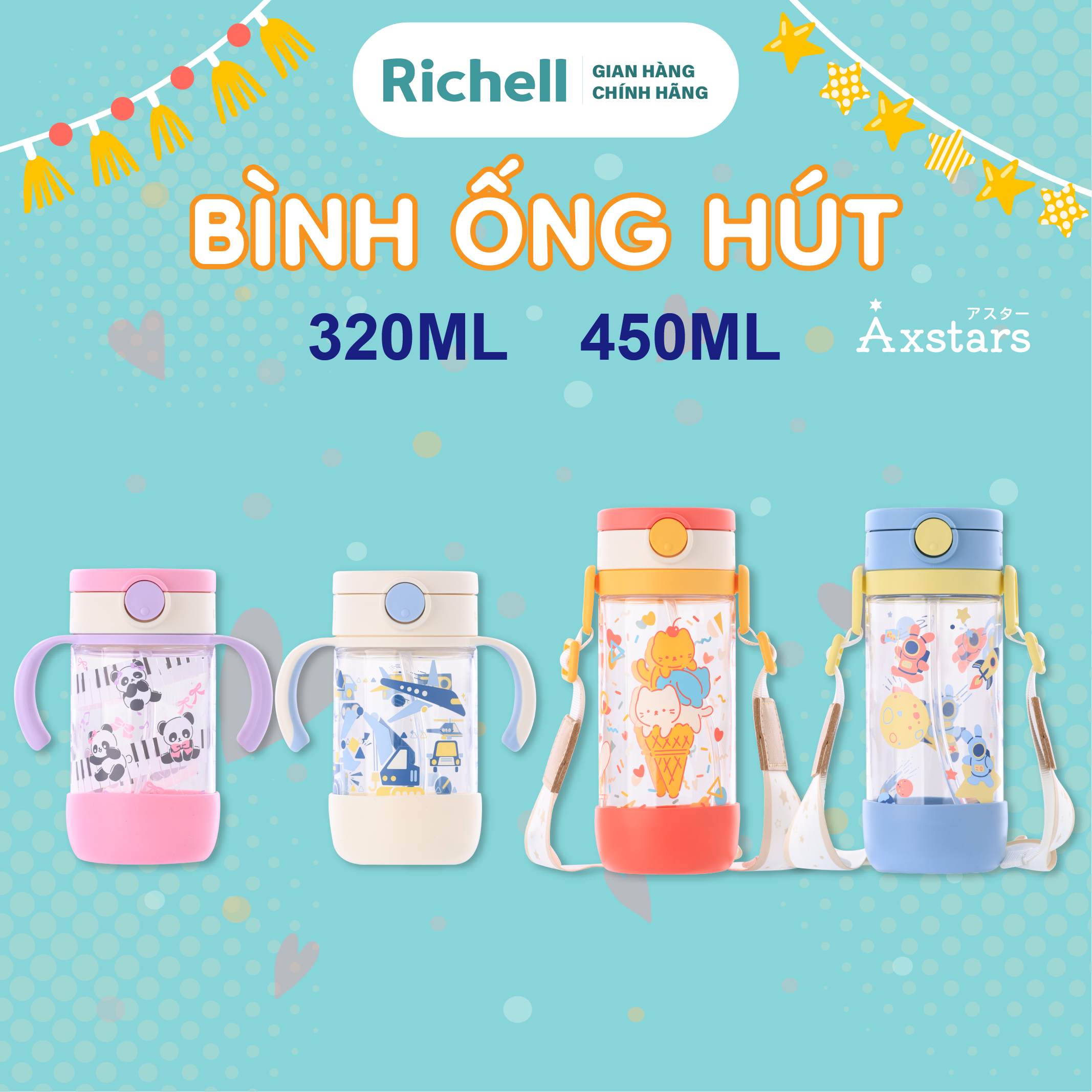 Bình ống hút Axstars Richell giúp con chăm uống nước hơn bao giờ hết, chống sặc, chống rò rỉ nước