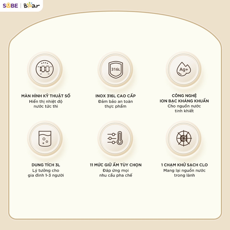 Đặc điểm nổi bật - 11 mức nhiệt tùy chỉnh, đáp ứng mọi nhu cầu thức uống - Ruột bình Inox 304, an toàn cho sức khỏe - Tự động khử Clo khi đun sôi,