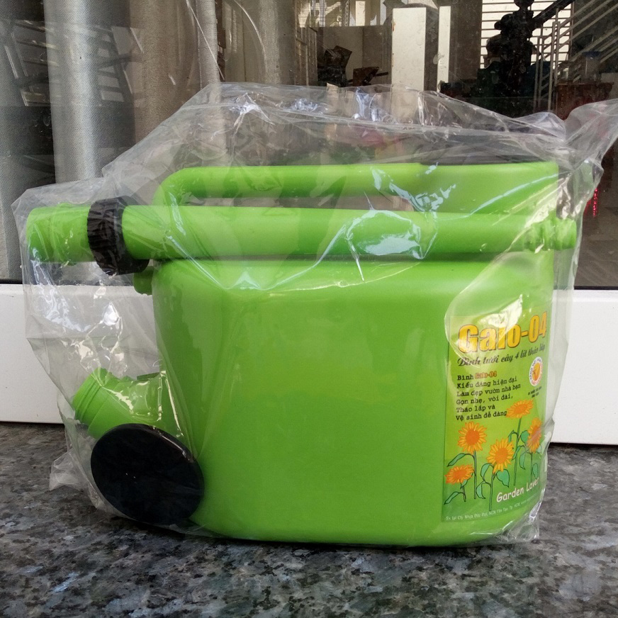 Bình tưới Galo 4 lít hàng Việt Nam chất lượng cao, được làm bằng nhựa bền chắc, gồm 3 phần thân bình, vòi tưới, ô doa tưới có thể tháo rời cất gọn, dễ dàng sử dụng. Bình tưới tháo lắp, vòi dài 35cm giúp tưới rau hoa dễ dàng hơn Dung tích: 4 lít - Trọng lượng tịnh: 0.45kg Chất liệu nhựa bền đẹp, không nứt vỡ khi để ngoài trời Hai công dụng: tưới phủ diện rộng hoặc tưới gốc Thiết kế gọn đẹp, trang nhã, rất tiện tay khi cầm Màu sắc: Xanh lá như hình